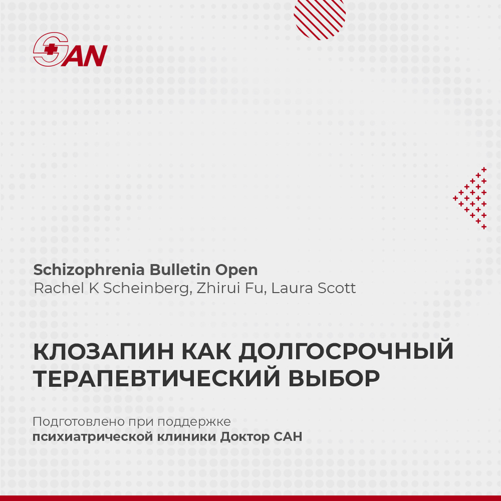 Лонгитюдное исследование, опубликованное в Schizophrenia Bulletin Open, изучала эффективность клозапина при длительном применении у пациентов с терапевтически резистентной шизофренией. В исследовании наблюдали 26 пациентов, начавших терапию клозапином в амбулаторных условиях. Уже через год отмечалось значимое снижение выраженности симптомов по шкале PANSS — в среднем на 18 баллов, 76,9 % достигли улучшения не менее чем на 20 %, а более половины 57,7 % перешли в категорию значимого улучшения (PANSS ≤ 58). Интересно, что почти четверть пациентов (23,1 %) ответили на лечение только спустя год терапии, что подчёркивает необходимость длительного наблюдения и недопустимость преждевременной отмены клозапина при отсутствии быстрого отклика. Наиболее выраженный эффект отмечался в отношении позитивной симптоматики и общей психопатологической нагрузки, тогда как влияние на негативные симптомы оставалось умеренным. Источник: https://academic.oup.com/schizbullopen/article/6/1/sgaf009/8153065