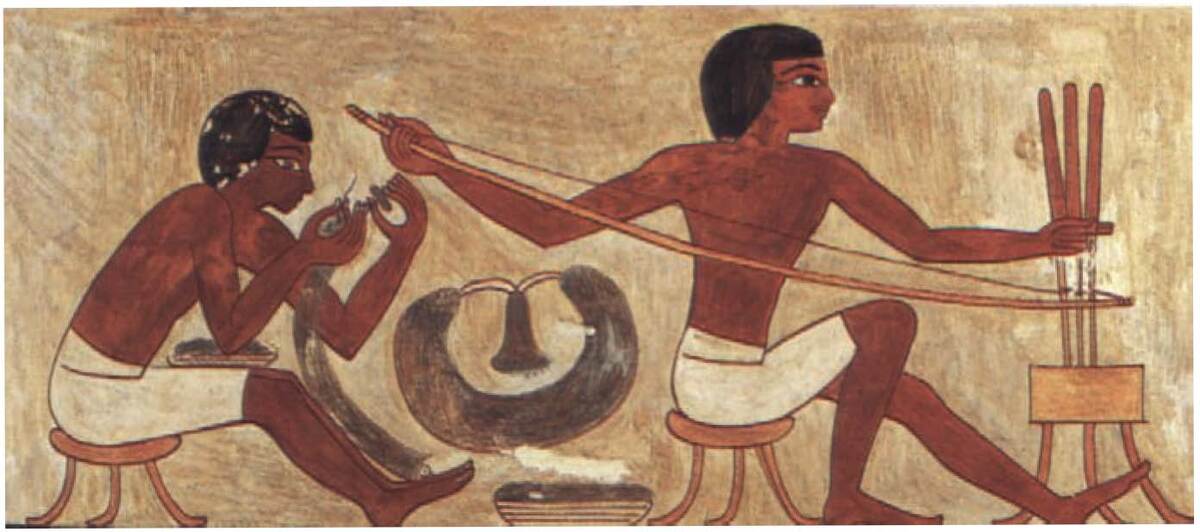 На этой копии настенной росписи, найденной на стене египетской гробницы, изображены два мастера за работой. Мужчина справа использует лучковые сверла, чтобы просверлить отверстия в бусинах, которые будет нанизывать его партнер. Между ними находится готовый широкий воротник и корзина с распущенными бусинами или нитками. Лучковые сверла использовались за тысячи лет до пятнадцатого века до нашей эры, когда художник изобразил этих мужчин за работой. Эта техника настолько практична, что используется и по сей день. Режущая способность сверла увеличивается за счет добавления песка или эмори в качестве абразива. Более крупные бусины просверливаются с каждого конца, а отверстия сходятся посередине. Хотя мастер обычно работает одним сверлом, этот мужчина использует сразу три, что свидетельствует о высоком мастерстве. Бусины, по-видимому, были вмурованы в гипс, чтобы удерживать их на месте во время сверления. Такие ремесленники объединялись в гильдии, и ремесленники разных специальностей