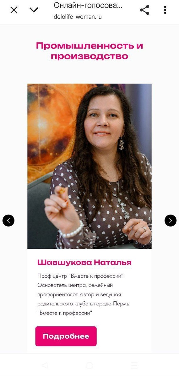 Уважаемые друзья, подписчики, клиенты! Я с гордостью сообщаю, что мой Проф центр "Выбери профессию своей мечты" и Родительский клуб «Вместе к профессии» представлены в номинации «Промышленность и производство» премии «Деловая жизнь женщины Пермского края». Для меня эта номинация — больше чем личное достижение. Это признание значимости моего дела. Дело, которым Я живу, развиваюсь: системная профориентация, поддержка семей и помощь детям в самом важном выборе — выборе своего пути. Каждый подросток, которому Я помогла обрести уверенность, и каждый родитель, который нашёл в моем клубе поддержку и ответы — это и есть моя главная награда. Теперь у меня есть шанс получить и общественное признание! Пожалуйста, поддержите мой проект своим голосом! 🙌 Для этого потребуется меньше минуты: 📌 Перейдите на сайт голосования: delolife-woman.ru/vote 📌 Найдите номинацию «Промышленность и производство». 📌 Выберите Наталью Шавшукову и подтвердите свой голос. Ваш голос — это вклад в развитие культ