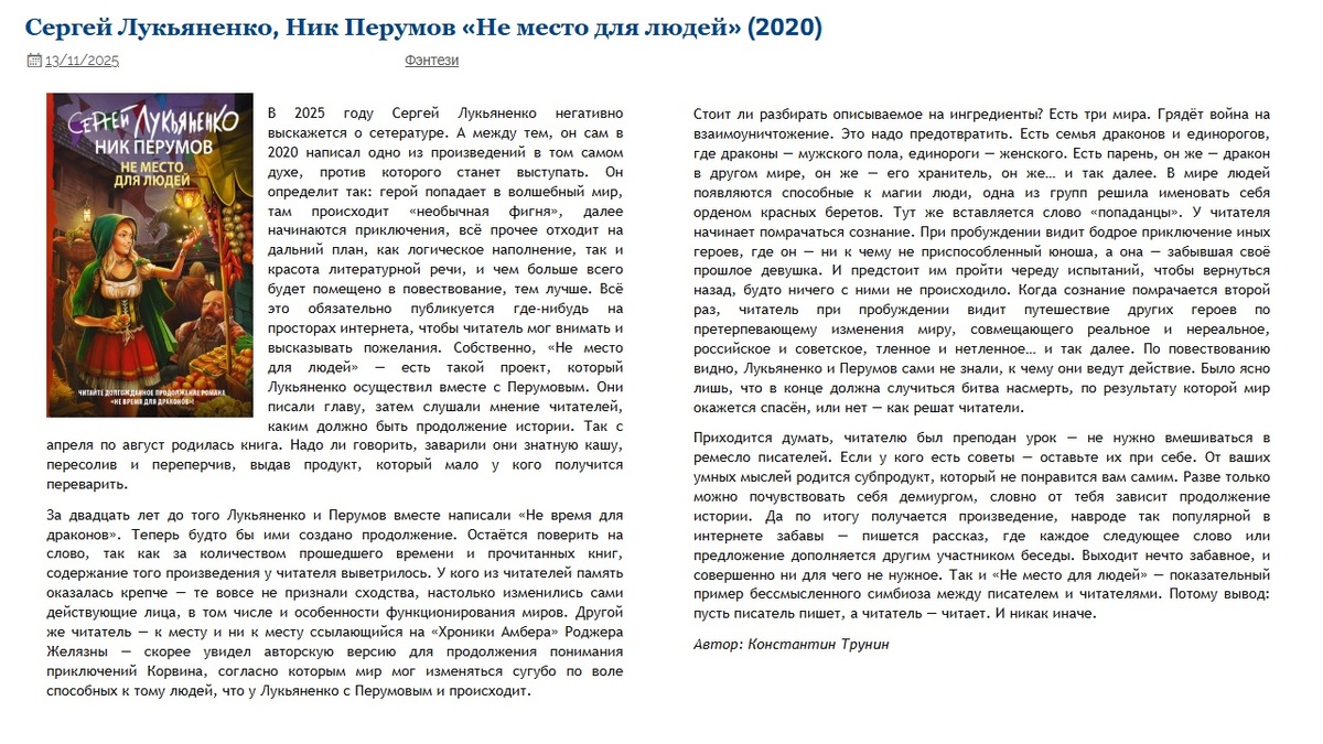 Сергей Лукьяненко, Ник Перумов «Не место для людей» Критика