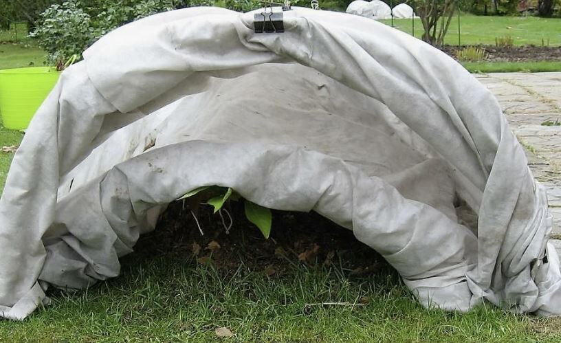 Оставляем только калий и фосфор — для укрепления тканей. Перед заморозками хорошо пролейте куст и замульчируйте основание: Это защитит корни от промерзания. 📌 Важно: не закрывайте герметично! Иначе при оттепели почки «запотеют» и сгниют. Такое укрытие подойдёт, если кустик ещё небольшой. Для дорогих сортов: Весной плёнку снимают первой, спанбонд — через пару неде