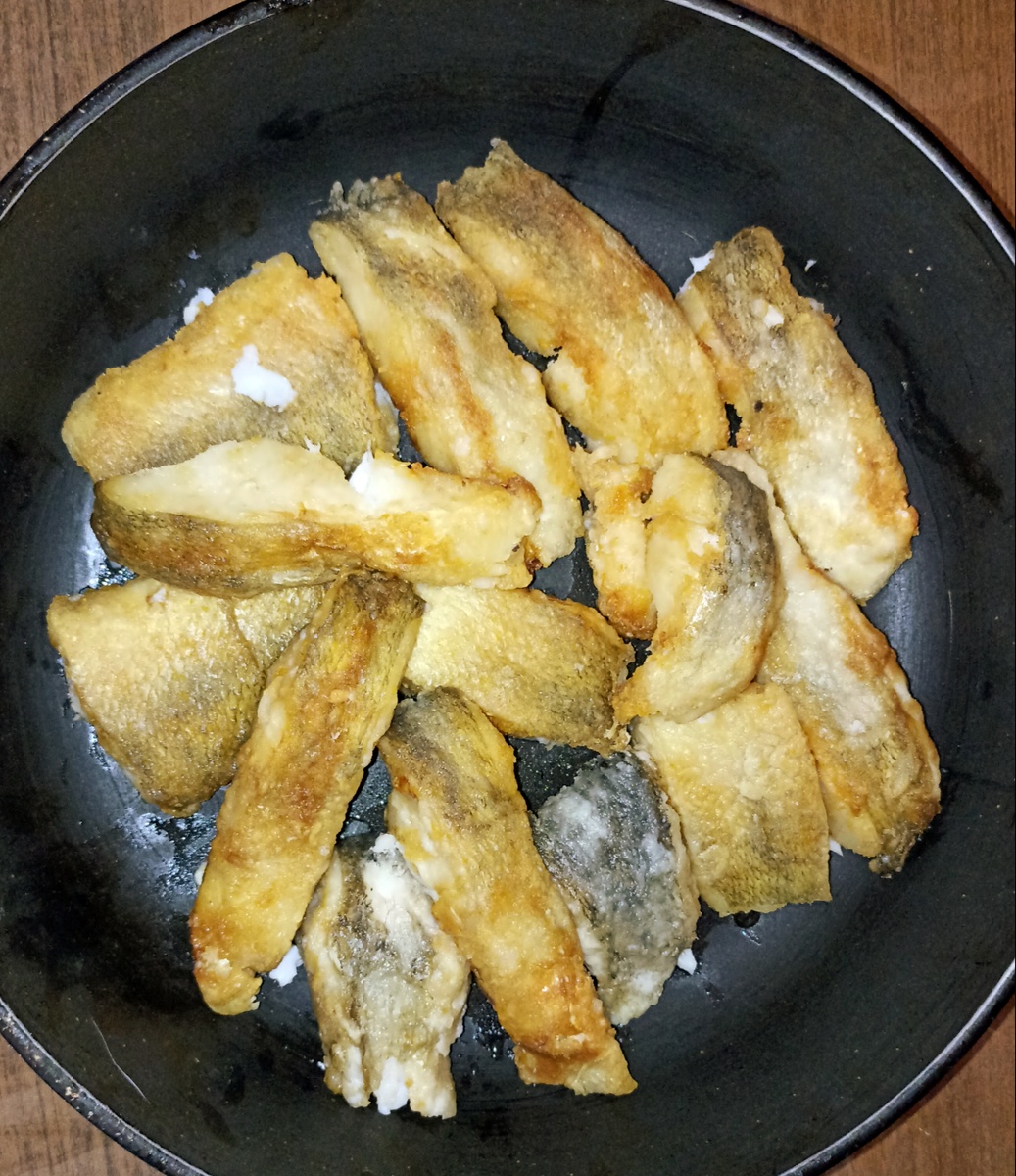 Затем обваляла кусочки в подсоленной муке и обжарила в растительном масле до хрустящей золотистой корочки.