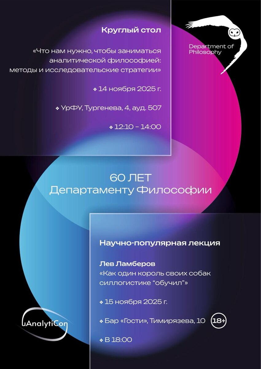 Завтра, 14 ноября, мы отмечаем 60-летний юбилей Департамента философии УрФУ! В честь этого мы решили организовать круглый стол на тему «Что нам надо, чтобы заниматься аналитической философией: методы и исследовательские стратегии». В программе: 🔹пленарный доклад Фридерике Мольтманн «Linguistic and Philosophical Intuitions and the Core-Periphery Distinction» 🔹выступление Ильи Гущина «К вопросу о возможности и необходимости устранения интуиций из философской аргументации» 🔹выступление Ольги Козыревой «Рассуждение о методе, или зачем строить модели в философии?» 🔹выступление Даниила Кокина «Мысленные эксперименты в аналитической политической философии». Все, кто хочет присоединиться к нашему круглому столу онлайн, могут зарегистрироваться вот тут, а очных участников мы будем ждать завтра к 12:00 в 507 аудитории корпуса на Тургенева, 4. Ну, а то, что одного дня для празднования нам мало, вы и так уже знаете: 15 ноября мы продолжим отмечать юбилей барной лекцией от Льва Ламберов