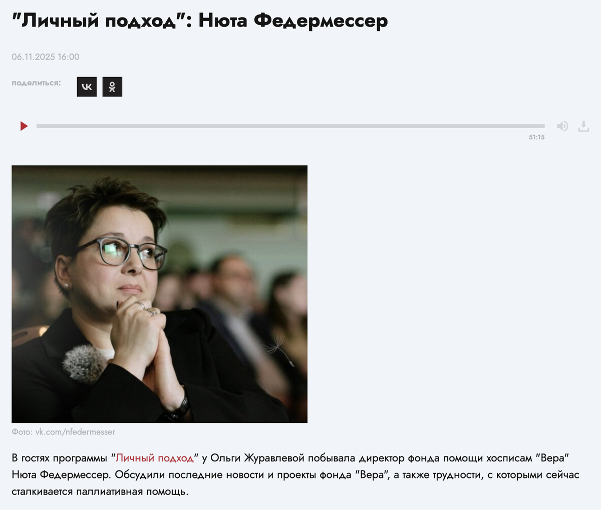 Как оставаться человеком в сложные времена? Где брать силы и надежду? Нюта Федермессер в подкасте Ольги Журавлевой «Личный подход» говорит об этом честно и просто. О том, что: ✨ Помогать другим — это естественная «гигиена души». ✨ Надежда может быть сильнее хандры. ✨ «Сейчастье» — это про счастье в настоящем моменте. Этот разговор не даёт готовых рецептов, но помогает по-новому взглянуть на важные вещи. 🎧 Обязательно послушайте — будет тепло и искренне: https://radiomoskvy.ru/audios/11746.
