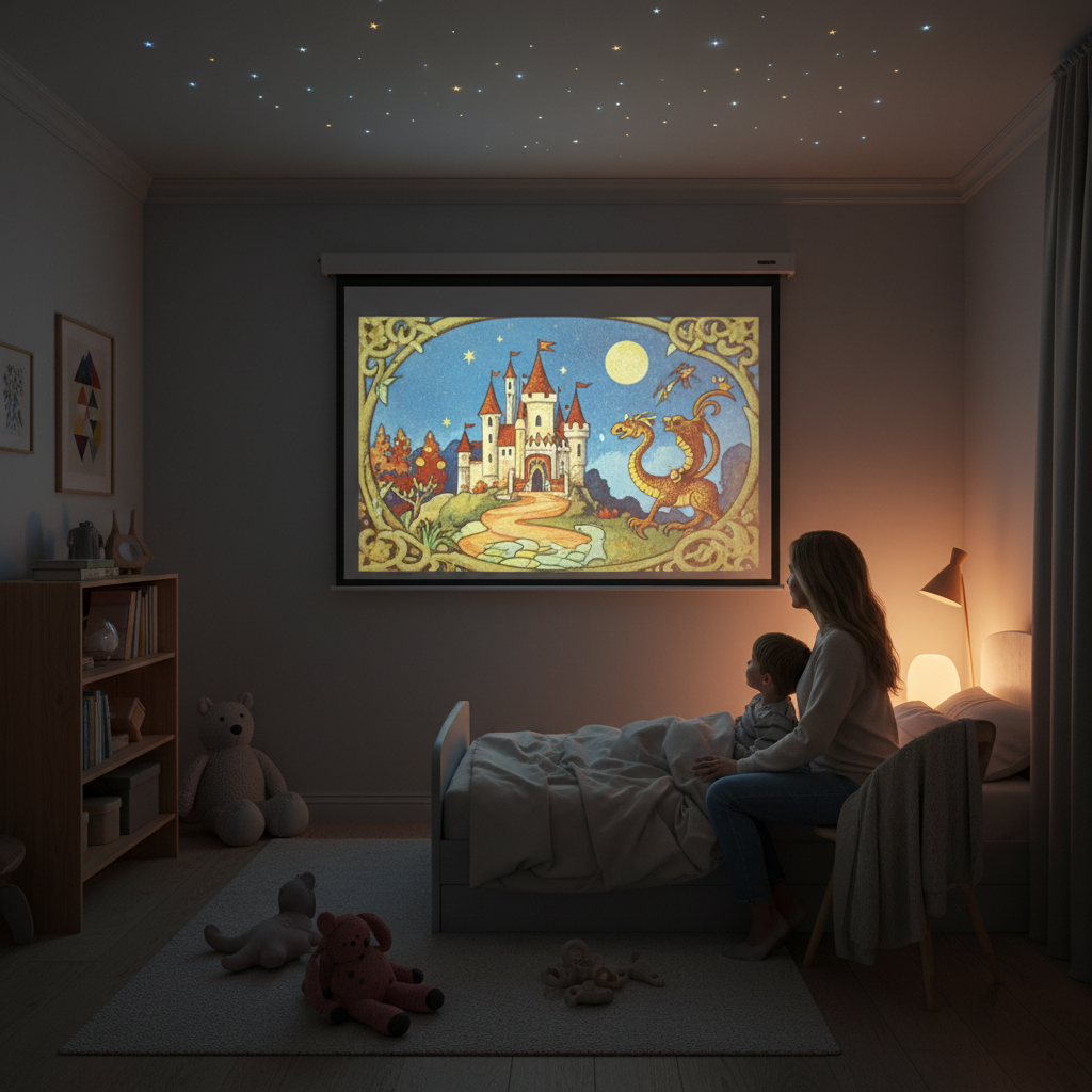 «Отражённый свет проектора безопаснее для детских глаз, чем прямой свет от экранов. Особенно это важно в вечернее время, когда зрачки расширены».
