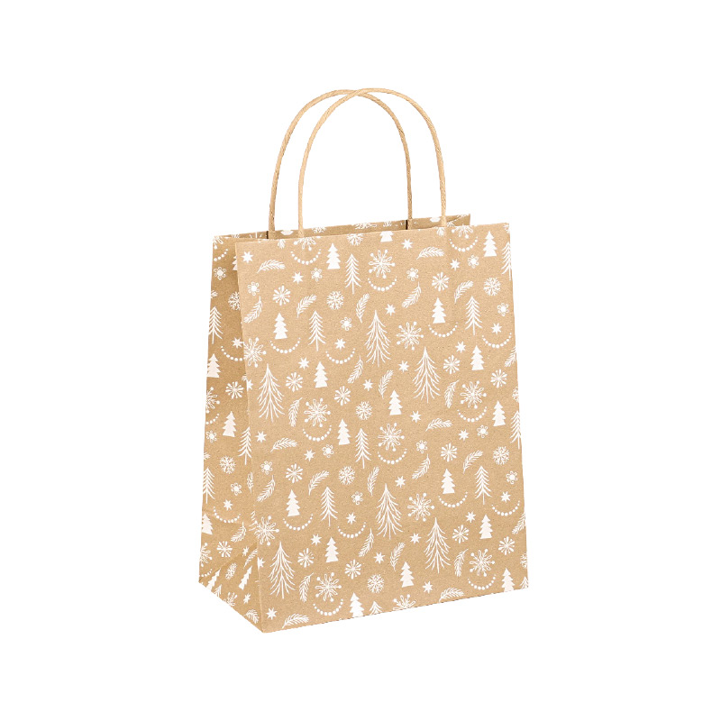 Бумажные новогодние пакеты, изготовленные из коричневой крафтовой бумаги, идеально подходят для последующего оформления, особенно — с применением белой краски.