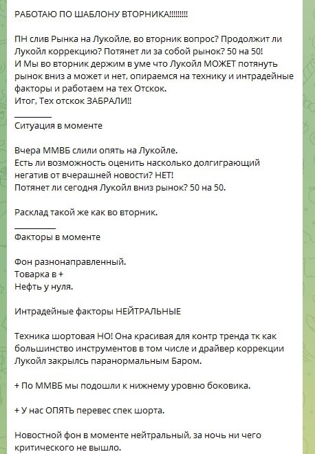 🆘В рамках обучения смотрим обзор. Это ежедневный обзор который выходит в закрытом ТГ канале ДО начала сессии. ❗️План на день, ЛОНГ, тех отскок опираясь на текущую ситуацию и технику + скрин с планом на день. ПОЧИТАЙТЕ!!! ____________ ❗️Итог, логика оказалась верной, как мсинимум обвала не было и технически мы сделали попытку отскока. ДА, сегодня была каша, не все инструменты пошли в отскок. НО!! В рамках дня за счет Риск менеджмента + ГМК +1.4% Пятерочка +2.5% Новатэк +0.6% Газпром стоп -0.3% Лукойл 2 стопа по -03% Полюс -0.3% Северсталь стоп -0.3% Пишу как есть, не приукрашивая. _________ ЮТУБ👉https://youtu.be/nXX2jIfW-fc ВК👉https://vk.com/wall-210912207_5201 🆘СМОТРИ ОБЗОРЫ!!! Хочешь ежедневно получать такую информацию до начала ОС?? Присоединяйся!!! ТГ канал @LaktionovPrivat_bot - Подписка отбивается за одну сделку!