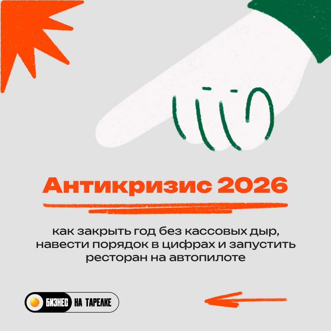 🧑💻 Не антикризис, а системный апгрейд ресторана В конце года большинство заведений работает "на автомате" — гасит кассовые разрывы, закрывает хвосты и старается не уйти в минус. Хотя зрелое управление — это не просто выживание, а система, где сервис, кухня и финансы работают в одном ритме. 🗓 18 ноября в 13:00 коллеги из канала Бизнес на тарелке проведут вебинар: "Антикризис 2026: как закрыть год без кассовых дыр, навести порядок в цифрах и запустить ресторан на автопилоте". Нам нужно серьезно с вами поговорить: — Как собственнику видеть реальные цифры, а не жить в догадках — Почему январь становится самым убыточным месяцем и как это исправить — Как AI и технологии помогают держать под контролем финансы, даже когда всё вокруг нестабильно — И как устроить эффективный "финансовый детокс" для ресторана 🎁 Бонусы за регистрацию: — GO-лист "Что должен видеть владелец каждый день" — Таблица "План без кассовых разрывов" — реальный Excel, по которому планируют финансы топ-рестораны.