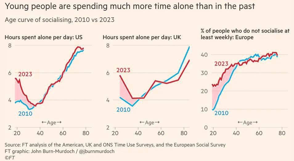 В США и Великобритании с 2010 по 2023 год объем времени, проведенного в одиночестве молодежью, вырос с 4 до почти 6 часов в сутки. В Европе за тот же период доля 20-летних, которые не социализируются хотя бы раз в неделю, увеличилась с 10% до 25%.
