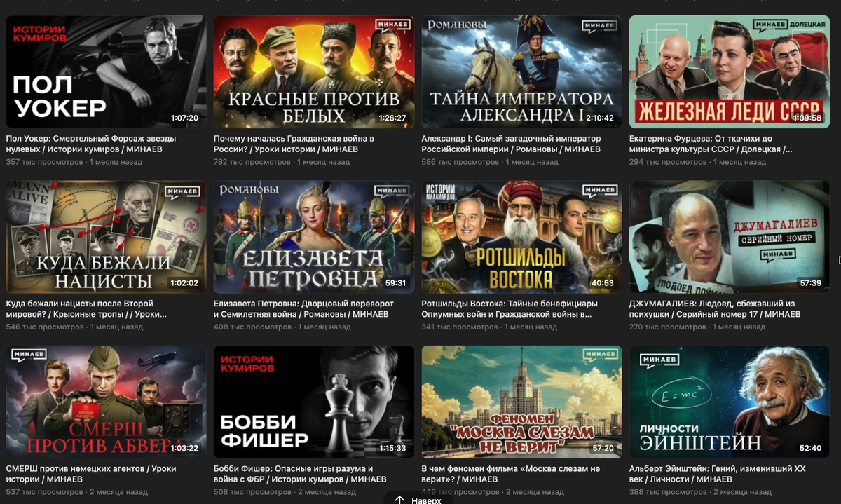 Когда я работала в медийке, образ Минаева вызывал у меня неприязнь — типичный глянцевый персонаж. Никакой симпатии. Через несколько лет в предложке попались его исторические видео на Minaevlive. Пересмотрела пару выпусков — мнение поменялось.