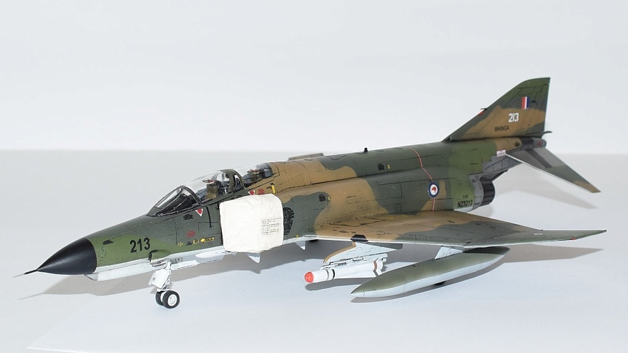 MDD F-4E Phantom II "Wairua" RNZAF Сергей Юрков ESCI, 1:72 ================================ O самом наборе. Это классический эсковский "фантом" с простой деталировкой, но весьма ажурный и в плане стоек, и в плане расшивки. Изначально хотел сделать вариант ВВС Австралии, но тема What-If для "правильного" масштаба меня увлекла и родилась эта новозеландская легенда. Она собрана "изкоробки" с ПВД "Мастер Моделз", колес "Экипаж", технички Print Scale, ракеты "Маверик" ResKit. Декали ОЗ и прочую "красоту" печатал сам. Также использовал декали для Sparrow из набора Italeri. Сам изготовил чехлы на ВЗ. Штоки передней стойки шасси заменены на иглы. Планер собрался без особых сложностей, если не считать то, что у меня были более идеальные представления о его сходимости. Пришлось повозиться с носовой частью фюзеляжа, со стыком ее с нижней поверхностью крыла и ВЗ. Из-за летней спешки первый вариант окраски был забракован и модель полностью перекрашена (также удалены кронштейны предкрылков в ко