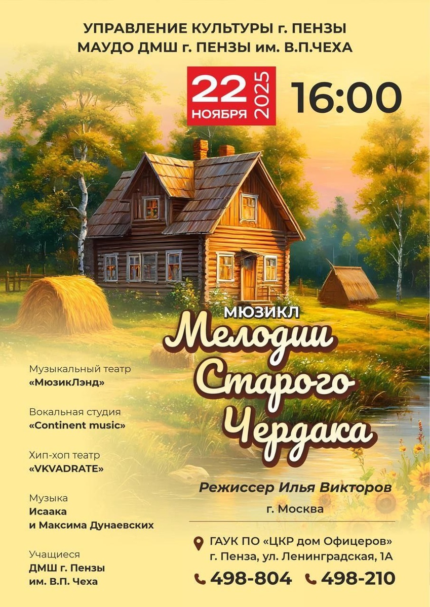 Дорогие друзья, родители и учащиеся нашей школы! ✨Мы приглашаем вас на необыкновенный детский музыкальный спектакль «Мелодии старого чердака», полный магии, ярких образов и прекрасной музыки Исаака и Максима Дунаевских. ✨В главных ролях - учащиеся нашей музыкальной школы (театральный коллектив "МюзикЛэнд" и Вокальная студия «CONTINENT MUSIC») ✨Детский музыкальный театр приготовил вам удивительную историю, полную красивых песен и ярких танцев, которые непременно затронут ваши сердца. ✨Вы услышите любимые хиты, погрузитесь в захватывающий сюжет, почувствуете тепло и радость семейной атмосферы. ✨Спешите присоединиться к нашему празднику! ✨Будьте уверены — мы сделаем этот вечер особенным и запоминающимся для вас и ваших близких! Заказ билетов по тел. 498804