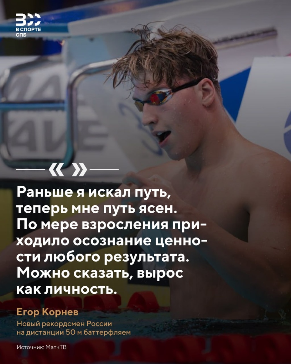 🗣️ Егор Корнев рассказал, за счёт чего ему удалось показать мощные результаты на чемпионате России по плаванию на короткой воде, который вчера завершился в Казани. 😮 Пловец СШОР «Экран» завоевал 4 золотых и 1 серебряную награды, установил новый рекорд России на дистанции 50 метров баттерфляем (21,73) и заплыл в топ-5 лучших результатов всех времен на 100-метровке вольным стилем (44,99). Главные достижения наших пловцов и сборной Санкт-Петербурга на чемпионате России: ➖ Команда Санкт-Петербург-1 выиграла медальный зачёт турнира. Наши пловцы завоевали 34 медали (19 золотых, 7 серебряных и 8 бронзовых). Второе место у команды Москва-1 — 22 медали (9-9-4). ➖ Лучшим по количеству медалей среди всех спортсменов на чемпионате стал петербуржец Кирилл Пригода — 3 золота на индивидуальных дистанциях 50, 100 и 200 м брассом, а также 3 первых места в эстафетных заплывах. ➖ Милана Степанова установила юношеский рекорд России в эстафете 200 м в/стиль (1:54,37). ➖ Лучший результат по очкам Wo