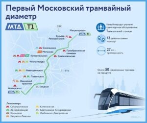 В Москве 13 ноября открылась линия первого трамвайного диаметра под индексом Т1. Протяженность маршрута составляет 27 километров рельсового полотна. Диаметр проходит через центральные районы Москвы и соединяет Метрогородок со станцией метро «Университет». Маршрут задуман как стратегическая транспортная артерия, объединяющая 13 административных районов столицы, обеспечивающая доступ к четырем железнодорожным вокзалам и 24 станциям метрополитена. По своим характеристикам и значению для городской инфраструктуры новая линия фактически представляет собой аналог наземного метро. Современный трамвай в разы сокращает время пути в ранее обделенные общественным транспортом локации Москвы. В частности, улучшается транспортная доступность проспекта Академика Сахарова и улицы Маши Порываевой, где прежде трамвайные маршруты отсутствовали. Для обслуживания пассажиров на линии задействовали 50 инновационных трамваев модели «Львёнок-Москва». Эти трамваи являются первыми в России, которые оснащены систе
