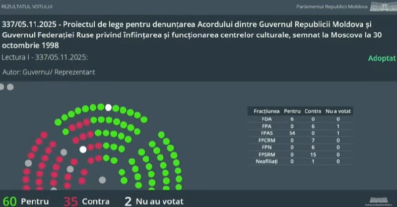 ⚡️🇲🇩Вот и всё За денонсацию соглашения РМ-РФ о деятельности культурных центров в первом чтении проголосовали 60 депутатов. Второе чтение законопроекта - через 10 дней. ☝️😒Российский культурный центр будет закрыт сразу же после вступления закона в силу. @eNewsmd.online 👈 Подписывайтесь на наш канал