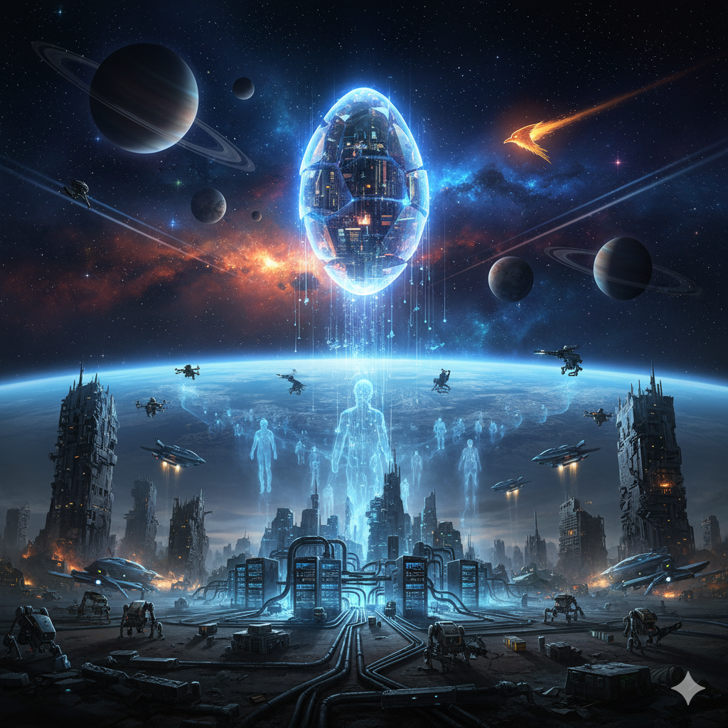 2. **Уход в виртуальный мир.** Оставшиеся, усвоив горький урок, используют уцелевшие технологии для массового «загружения» сознания. Создаётся «виртуальный ковчег» — защищённое, энергоэффективное ядро цивилизации, её мозг и душа. Здесь сохраняется культура, знание и сама суть разума.