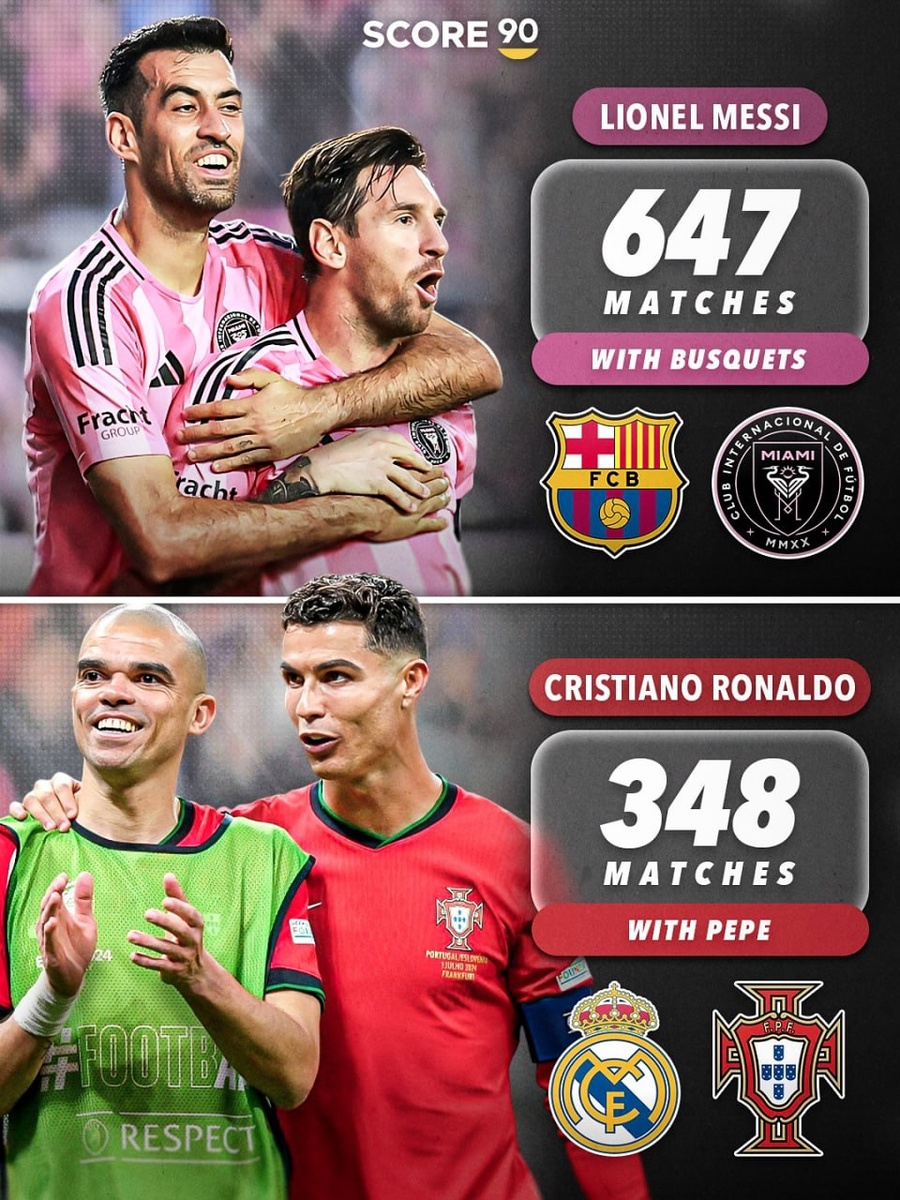 Самые верные партнёры двух легенд современности Серхио Бускетс и Пепе провели наибольшее количество совместных игр вместе с Лионелем Месси и Криштиану Роналду. У Месси так же в топ-3 по матчам входят Пике (506) и Иньеста (489). А у Роналду - Бензема (342) и Рамос (339)! ⚽️ Подписывайтесь на нас в MAX