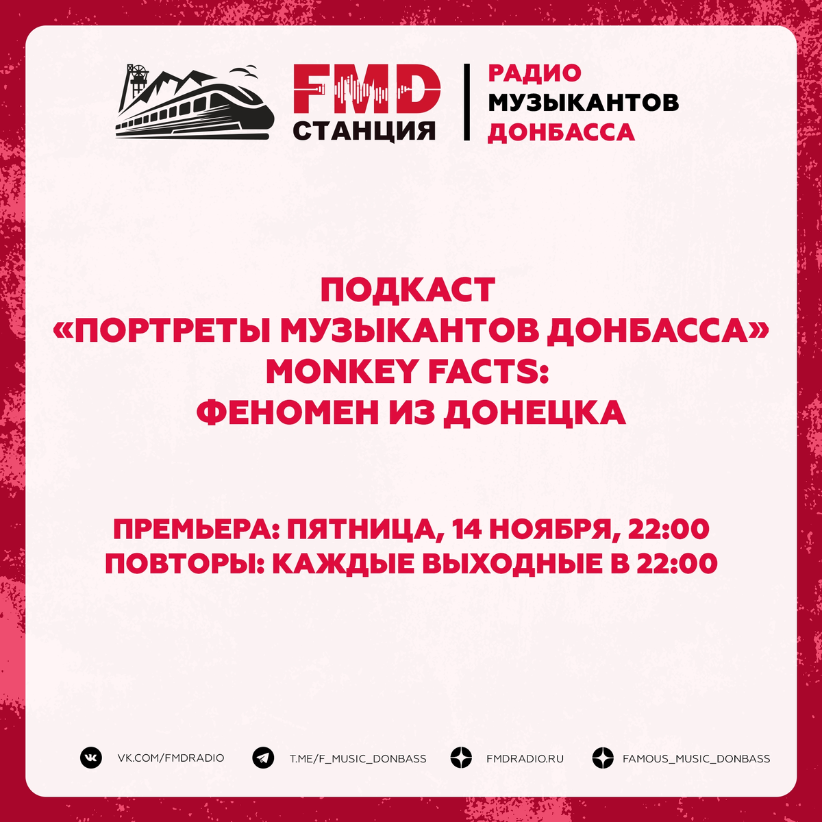 Полную историю группы — слушайте каждые выходные в подкасте «Портреты» на радио Музыкантов Донбасса. Фурия и три злоумышленника. Их дебют состоялся год назад. Первый сингл стал «лучшим релизом месяца». С тех пор каждая новая песня — событие. Они смело плавят рэп на жестких гитарных рифах. Каждый концерт — вынос мозга: плотно, громко, атомно. О них обязательно напишут книгу, но сначала ведущие радио Музыкантов Донбасса должны разобраться с феноменом Обезьян. В эту пятницу (14 нноября) в программе «Портреты» на «Станции FMD» — полная история группы Monkey Facts. Слушатели должны узнать: И чтобы два раза не вставать! В субботу 15 ноября Monkey Facts выйдут на сцену Gung'Ю'Bazz Bar вместе с Озером Мачигенга. Тот случай, когда страшно за мебель старого клуба. Премьера передачи: пятница, 22:00