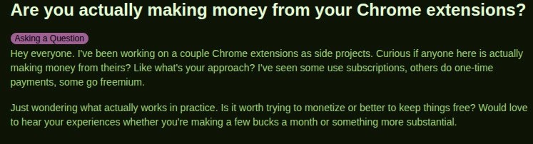 А на своих Chrome-расширениях кто-то вообще деньги делает? Смотрите, какой вопрос в ленте - парень спрашивает, реально ли заработать на расширениях для браузера. Ну и дела, тема-то больная... Одни кричат, что это нереально без крутого продукта и мощного маркетинга. Другие - что всё бесплатно и никто не платит. А ведь многие разработчики так и делают - пилят расширения годами, просто молчат о доходах. А в комментах такой разброс мнений! Один пишет, что у него платное расширение, но ни одной продажи. Другой хвастается тремя премиум-пользователями и $10 в месяц. Самые адекватные признаются: все расширения бесплатные, денег ноль. Я вот заметил, что в нише блокировщиков рекламы вообще жесть - все привыкли к uBlock Origin и не хотят платить. Меня бесит, когда люди не ценят чужой труд, ожидая всё бесплатно :) - хотя сам люблю халяву. А ещё смешно, что один разработчик с 1.6 млн подписчиков в Instagram продвигал своё расширение - и ноль долларов. Вот тебе и охват! Вот и думай теперь - ст