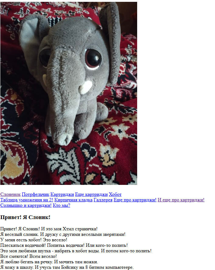 Я в этом году начал учиться хтмл. И веб грамотности. И это мой первый уже проект. По выученным урокам. Он полусерьезный проект. Это мечта. Которую я реализовал. И полу тренировочный проект. Для тренировки простого хтмл. Это первый проект. По этому хочется немного сделать вводную часть. Здесь я тренирую самый простой хтмл. Потому я его выучил. В простом виде. И теперь практикую. Сначала у себя локально. А потом уже первый проект. Вот теперь от технической части. К идее. Это мечта. Проект мечты. Мои друзья. Добрые зверята. Их много! Они маленькие. По крайней мере некоторые из них. Ходят в школу и там много учатся. Разному. Программированию на Бэйсике, музыке. Астрономии, всякому разному. Словом. Это про добрых зверят. От небольших игр - к вэб. Добрые зверята теперь и в сети! Теперь, это сайтик еще. Про слоника. Самый первый сайтик. После уроков по хтмл. Да, я писал сайт и раньше, но почти без знаний. Теперь, со знаниями! А теперь к слонику перейдем! Знакомьтесь! Это слоник! Он маленький