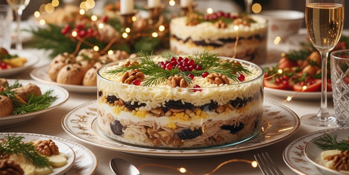 Откройте для себя оригинальный салат с курицей, черносливом и орехами. Это блюдо станет изюминкой вашего новогоднего стола. Пошаговый рецепт поможет легко повторить его дома. С приближением зимних праздников многие задумываются, чем порадовать близких за праздничным столом. В этом году предлагаем обратить внимание на необычный салат, который сочетает в себе куриное филе, чернослив и грецкие орехи. Такое блюдо не только украсит новогодний ужин, но и приятно удивит гостей своим вкусом и текстурой. Для приготовления понадобятся простые продукты: отварная курица, яйца, лук, яблоко, сыр, чернослив, грецкие орехи и майонез. Все ингредиенты легко найти в любом магазине, а сам процесс не займет много времени. Главное — соблюдать последовательность слоев, чтобы добиться идеального баланса вкусов. Первым делом нарежьте куриное филе небольшими кубиками и выложите на дно салатника. Слегка смажьте майонезом, чтобы мясо стало более сочным. Следующий слой — мелко нарезанный лук, который также покрыва