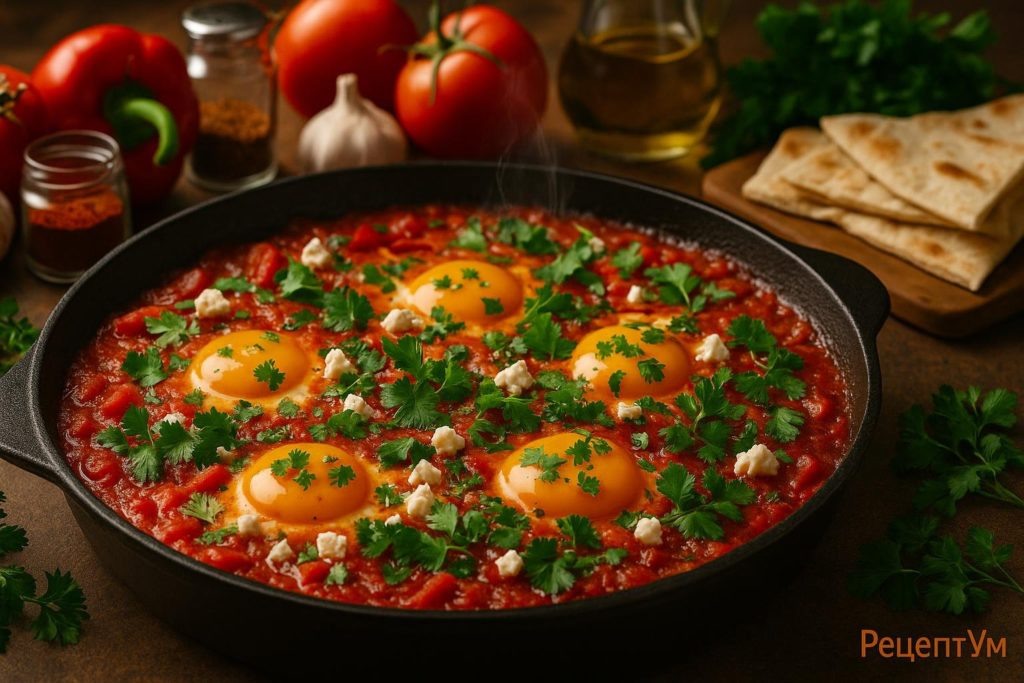Израильская классика: часто с фетой и тахини (кунжутной пастой) для подачи. Мексиканские влияния — с авокадо, кинзой и лаймом сверху. Каждая страна добавляет что-то своё, но томатно-яичная основа остаётся неизменной!