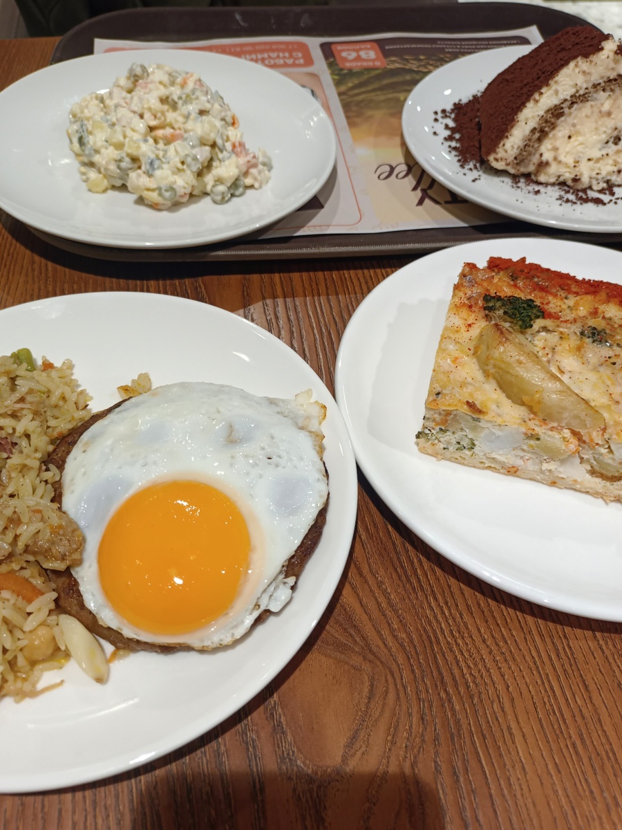 Но с завтраком-обедом я перегнул конечно палку. Таким обжоркой быть нельзя. Тут и плов с уткой и бифштекс с рубленной говядиной. Мурманский рыбный пирог и воздушное тирамису. А вот оливье было лишним, но очень хотелось приблизить новый год 😋