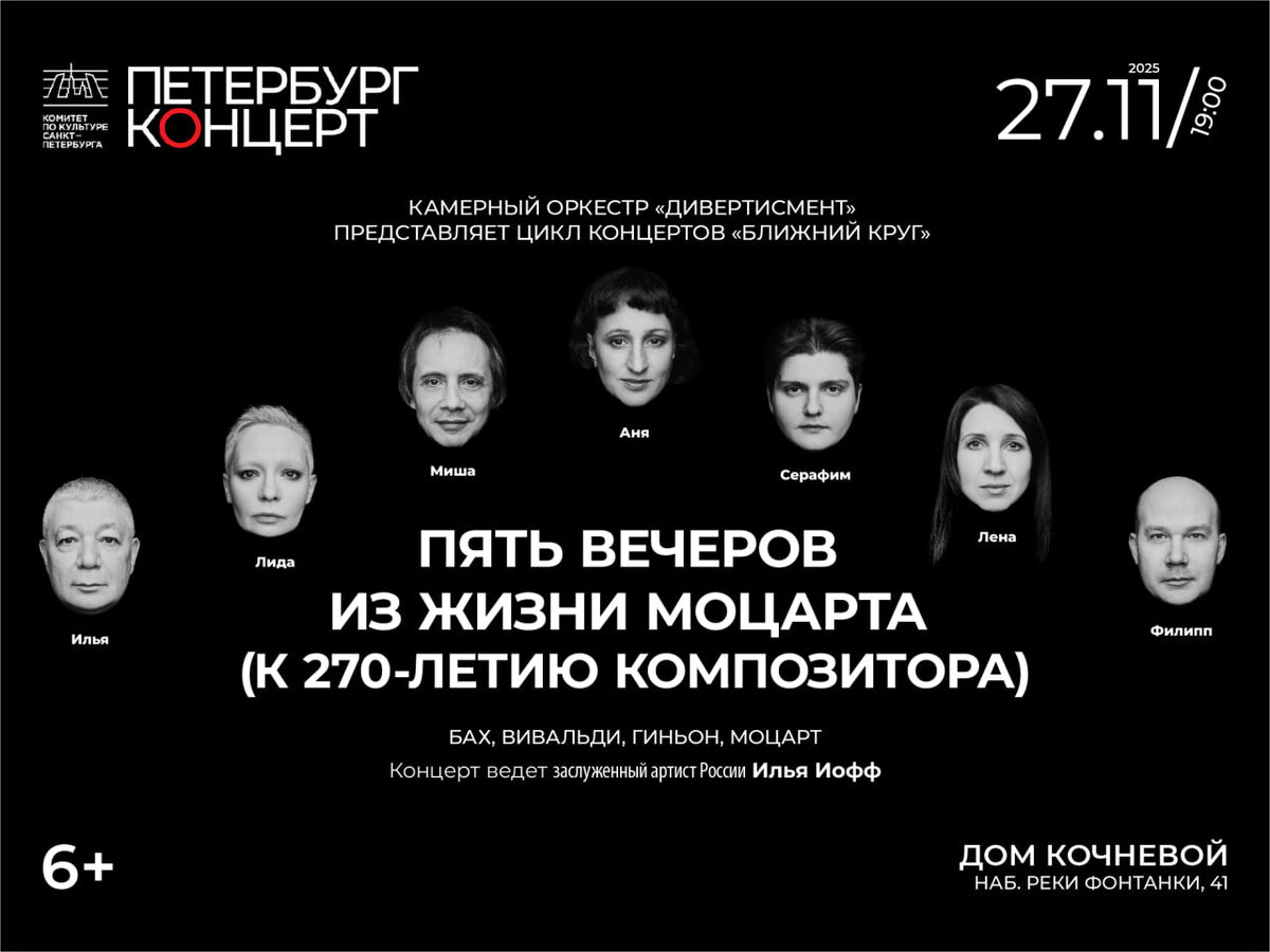 Второй вечер из жизни Моцарта от Камерного оркестра «Дивертисмент» в рамках полюбившегося цикла «Ближний круг» — 27 ноября в Доме Кочневой! Программа из пяти концертов приурочена к 270-летию со дня рождения Моцарта и объединит в себе сочинения австрийского гения и его великих предшественников, оказавших влияние на становление его творчества. Во втором концерте прозвучат сонаты Вивальди, Баха и французского скрипача-виртуоза Гиньона, служившие образцами камерного музицирования для венского классика. Украсит вечер увертюра к опере «Свадьба Фигаро», созданная Моцартом словно на одном дыхании и запечатлевшая юмор, лирику и веселье блистательной комедии положений. БИЛЕТЫ: 27.11 | 19:00 | Пять вечеров из жизни Моцарта. Вечер второй