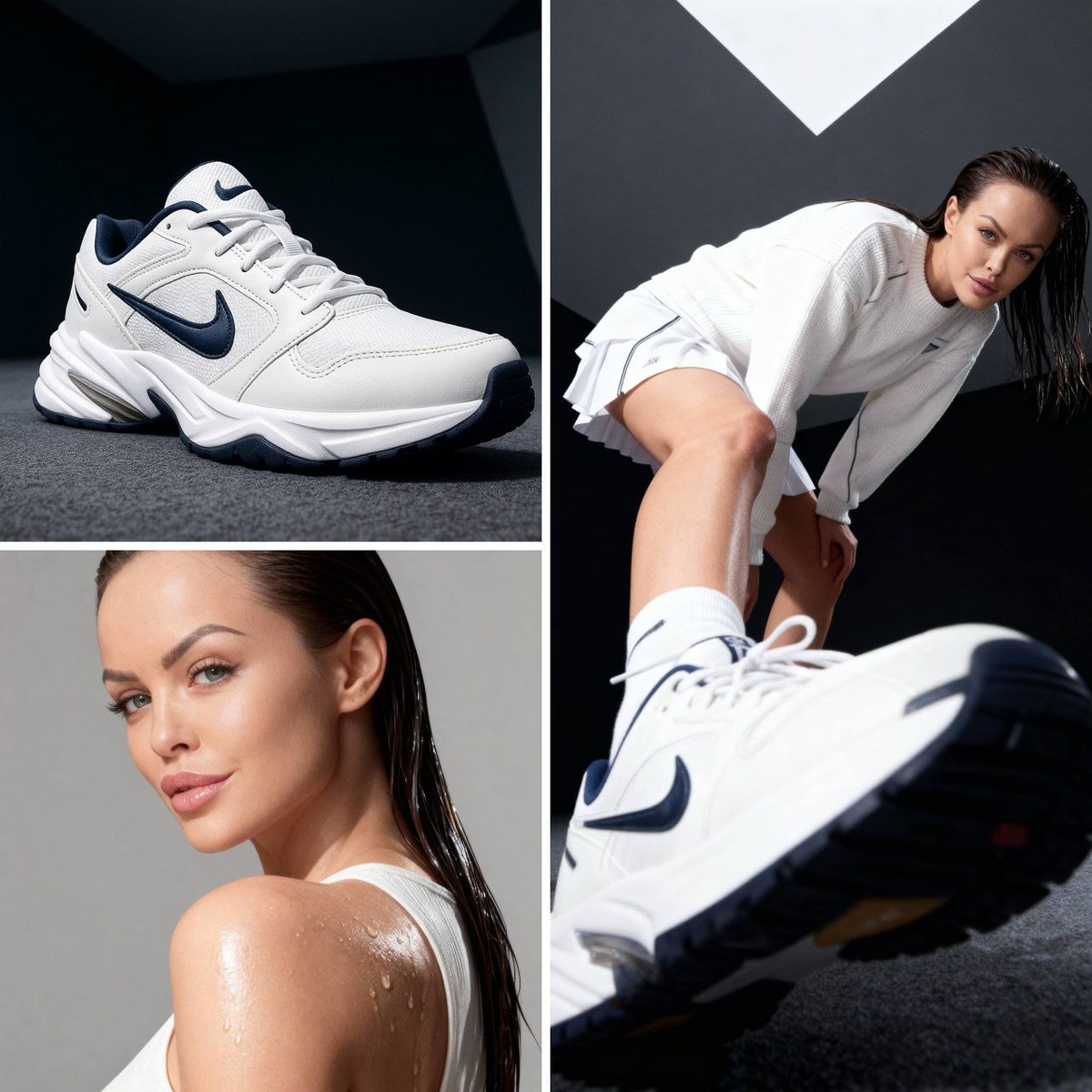 Из двух фото в стильное рекламное изображение - использовали модель Sora, тк эта нейросеть рисует более "стильные" изображения. - если Sora искажает предметы или не сохраняет оригинальные черты лица то используйте Banana Pro - также не забывайте, если цель это генерация фото для маркетплейсов, то необходимы пропорции 3:4. Sora (Chat GPT) не поддерживает 3:4, но ее результат в последующем можно прогнать через Banana Pro или Seedream4 для изменения пропорций. Чат подписчиков: @ChatGptCyberbot Промт: Model leaning towards the camera, low angle, ultra wide angle lens, one leg extended towards the camera, sneaker in focus, dynamic editorial pose, futuristic white tracksuit made of a sweater and a short tennis skirt, Deep studio lighting, contrasts, geometric background, fashion magazine style. Glamorous photorealism.