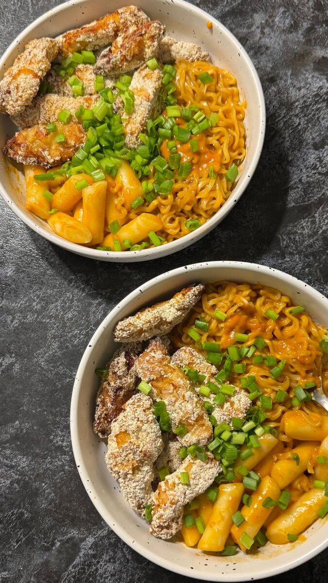 Попросили рецепт, поэтому с удовольствием делюсь с вами 👇 КБЖУ 754/ 44,3/ 23,7/ 91,5 Ингредиенты: 🔹Филе куриное - 110 г; 🔹Сухари панировочные - 22 г; 🔹Чан Рамен - 60 г (1/2 упаковки); 🔹Сыр плавленный тертый Чеддер - 40 г; 🔹Rice cake teopoki (Токпокки) - 60 г; 🔹Соус Булдак карбонара - 2 г. Процесс приготовления: 1️⃣Куриное филе режем на слайсы, добавляем соль, обмакиваем в панировочных сухарях и в духовку при 200 градусах на 20 минут, главное не пересушить. Вместо филе можно в духовке приготовить наггетсы 🙂 2️⃣В сковороду заливаем воду, доводим до кипения, добавляем Чан Рамен и Токпокки и варим ~ 5 минут (вся вода впитается) 🥘 3️⃣Добавляем в сковороду специи из Чан Рамена, соус Булдак, сыр Чеддер и все перемешиваем 👇 4️⃣выкладываем в тарелку Чан Рамен и Токпокки, добавляем куриное филе в панировке, при желании, еще зеленый лук колечками и наслаждаемся 🍱 P.s. Причем мы часто делаем все тоже самое только без Токпокки ☺️