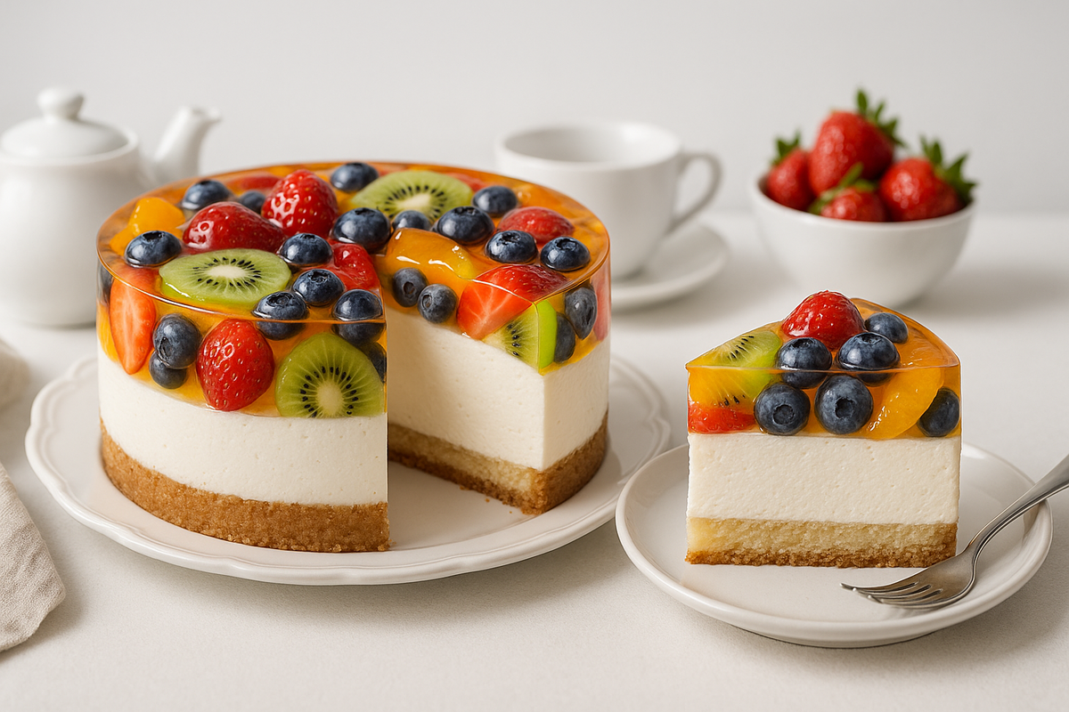 Нежный бисквит, воздушное йогуртовое суфле и яркие фрукты под прозрачным желе. Лёгкий, свежий и нарядный - этот торт готовится проще, чем выглядит, и каждый раз получается идеально. Калорийность на 100 г: 189 ккал • Б/Ж/У: 4.2 / 6.3 / 28.1 Ингредиенты: 3 яйца, 120 г сахара, 120 г муки, 1 ч. л. разрыхлителя, щепотка соли. Приготовление: Взбить белки с солью до плотной пены. Желтки взбить с сахаром до светлой массы, соединить с белками. Аккуратно вмешать муку и разрыхлитель. Выпекать при 175 °C 25–30 минут, остудить. Ингредиенты: 120 мл воды, 2 ст. л. сахара, 1 ч. л. лимонного сока или ваниль. Приготовление: Сварить сироп, остудить. Промазать остывший бисквит кисточкой, чтобы он стал влажным и нежным, но не расползался. Ингредиенты: 400 г густого йогурта, 200 мл сливок 33%, 80-100 г сахара, ваниль, 15 г желатина + 60 мл воды. Приготовление: Желатин замочить, распустить. Сливки взбить до мягких пиков. Йогурт смешать с сахаром и ванилью, добавить тёплый желатин тонкой струйкой, вмешать сли