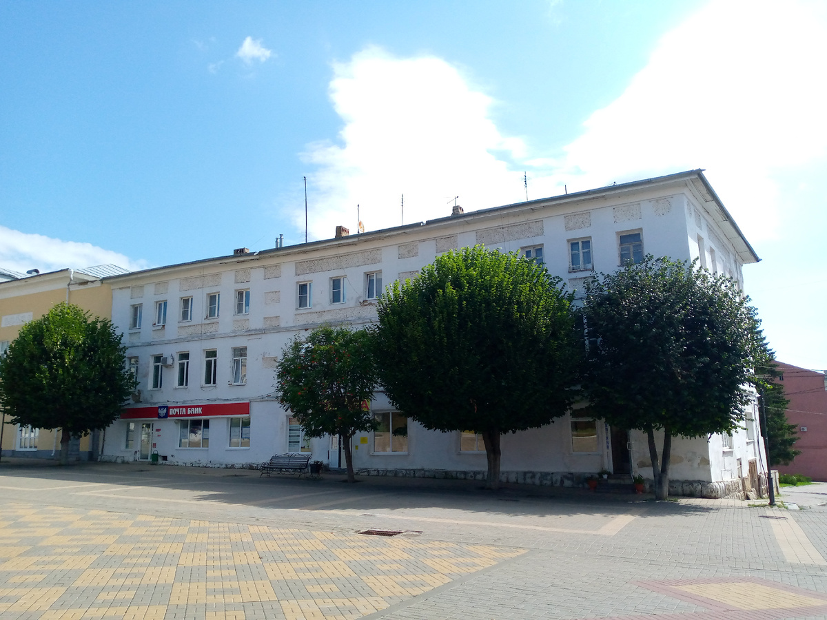 Трехэтажное каменное прямоугольное в плане здание расположено на пересечении улиц и протяженным западным фасадом выступает на красную линию ул. Мира, южным боковым на красную линию ул. Свердлова. К северному фасаду примыкает здание, полностью его перекрывая. Фасады по горизонтали разделены междуэтажными поясками, венчаются карнизом простой формы. Оштукатуренные стены прорезаны прямоугольными проёмами. Плоскость фасадов третьего этажа оформлена филенками, поля которых, отделаны фактурной штукатуркой, располагающими под окнами и над ними.