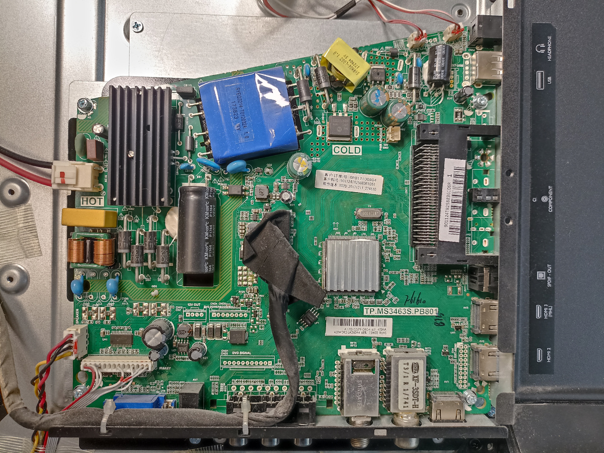 Майн плата tp.ms3463s.pb801, со всеми проводками на месте. И t-con 6870с0532 также со всеми проводками на месте. А что с напряжениями? А с напряжениями следующее.