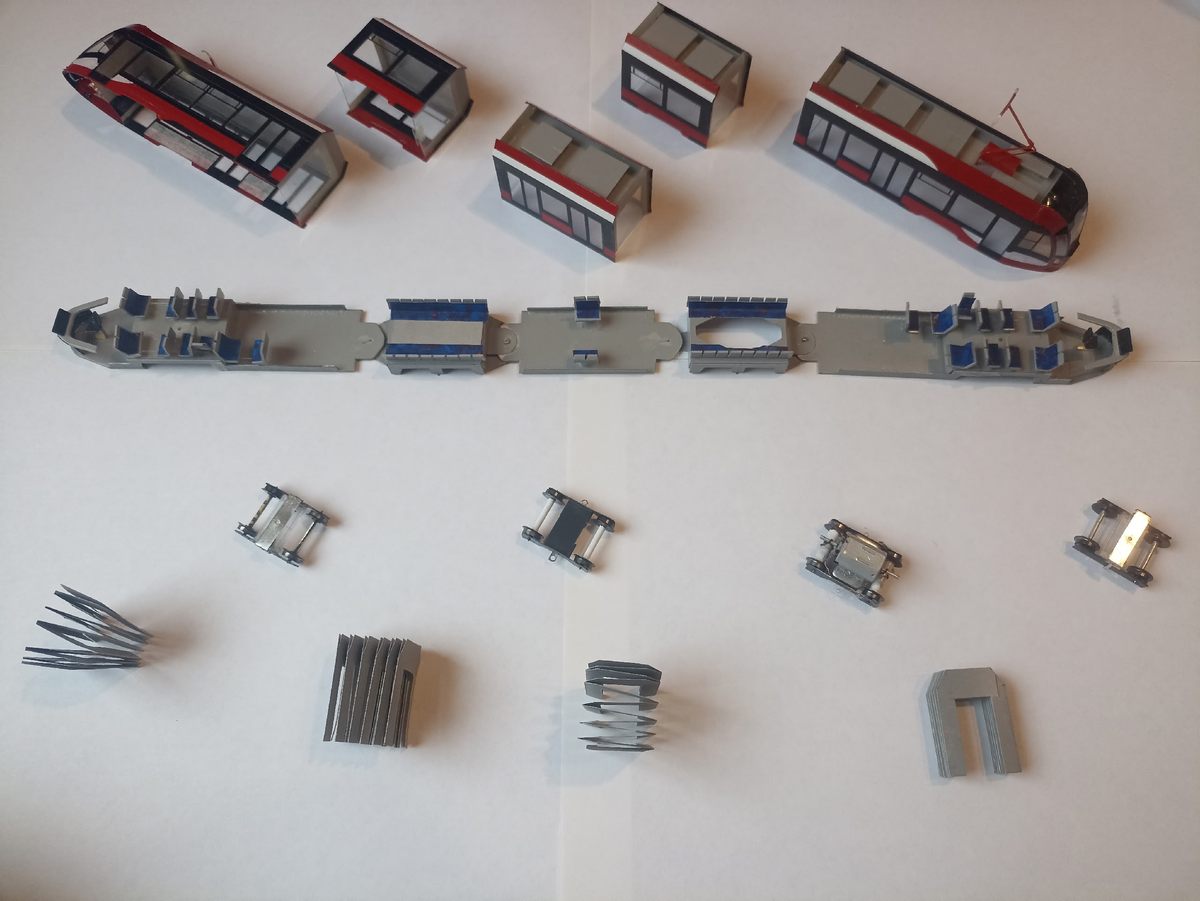 Не успел еще толком появиться на свет трамвайный вагон "Воевода", а уже появилась его модель. Дело в том, что модель была представлена в середине осени 2025 года, а сам вагон на тот момент хоть и был готов и даже участвовал летом в выставке толком еще не обкатывался, а тем более с пассажирами. Немного о модели. Модель изготовлена в масштабе 1:87 любителем трамвая с ником "ТРАМФАН". Тележки вагона изготовлены из пластика толщиной 0,5 мм, металла, пружины из алюминиевой банки. В качестве материалов рамы применены: ПВХ толщиной 1 мм (пол, сиденья, пульт), ПЭТ 0,3 мм (подиумы), металл (сочленения). Кузов изготовлен из ПЭТ 0,3 мм (борта, потолок, токоприемники, лобовое стекло), бумаги (гармошки), ПВХ 1 мм (ящики на крыше). Окраска: краска акриловая в баллончике (кузов, крыша, рама, тележки, токоприемники), маркер, черный скотч (зона стекол). Посмотрим фотографии как готовой модели, так и комплектующих из которых она состоит. Комплектующие: Готовая модель: Модель изготовлена ручным способо