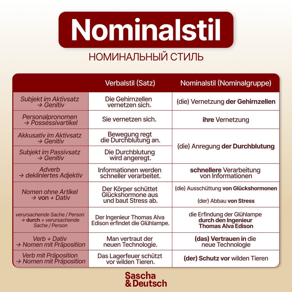 Бытует мнение, что на продвинутых уровнях уже нечему учиться, всё пройдено и новых тем уже не будет. Но есть множество тонкостей, которые не только обогатят вашу речь, но и помогут уверенно сдать экзамен на уровень C1! И сегодня мы поговорим о номинальном стиле. Что это такое и с чем его едят? 📌Номинальный стиль (Nominalstil) — это способ изложения мыслей, при котором глагольные конструкции заменяются существительными, что позволяет подавать информацию более сжато. 🔴Если в Verbalstil для идеи нужно целое предложение, то в номинальном она выражается компактной Nominalgruppe. Nominalstil преобладает в формальных контекстах: в официально-деловом языке и профессиональной литературе. Также он часто встречается в пунктах списков и заголовках. 🔴Центром именной группы является существительное, часто образованное от глагола. sich vernetzen (связываться) → die Vernetzung При преобразовании глагола с Dativ в именную группу к существительному добавляется предлог. helfen (помогать) → die Hilfe b