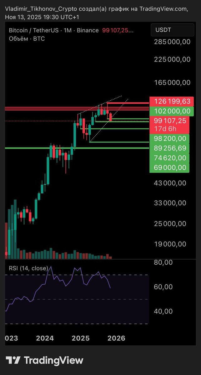 $BTC Впервые за всю историю на месячном таймфрейме на битке сформирована такая красивая и ярко выраженная медвежья дивергенция. Бычья/медвежья дивергенция это исторически самый сильный сигнал и чем старше таймфрейм тем сильнее сигнал. Падать будем минимум до 50 уровня по RSI. С отскоками, остановками, боковиками и постоянными откупами дна, но будут стучаться снизу. Глобально главное не уходить под 50 уровень RSI.