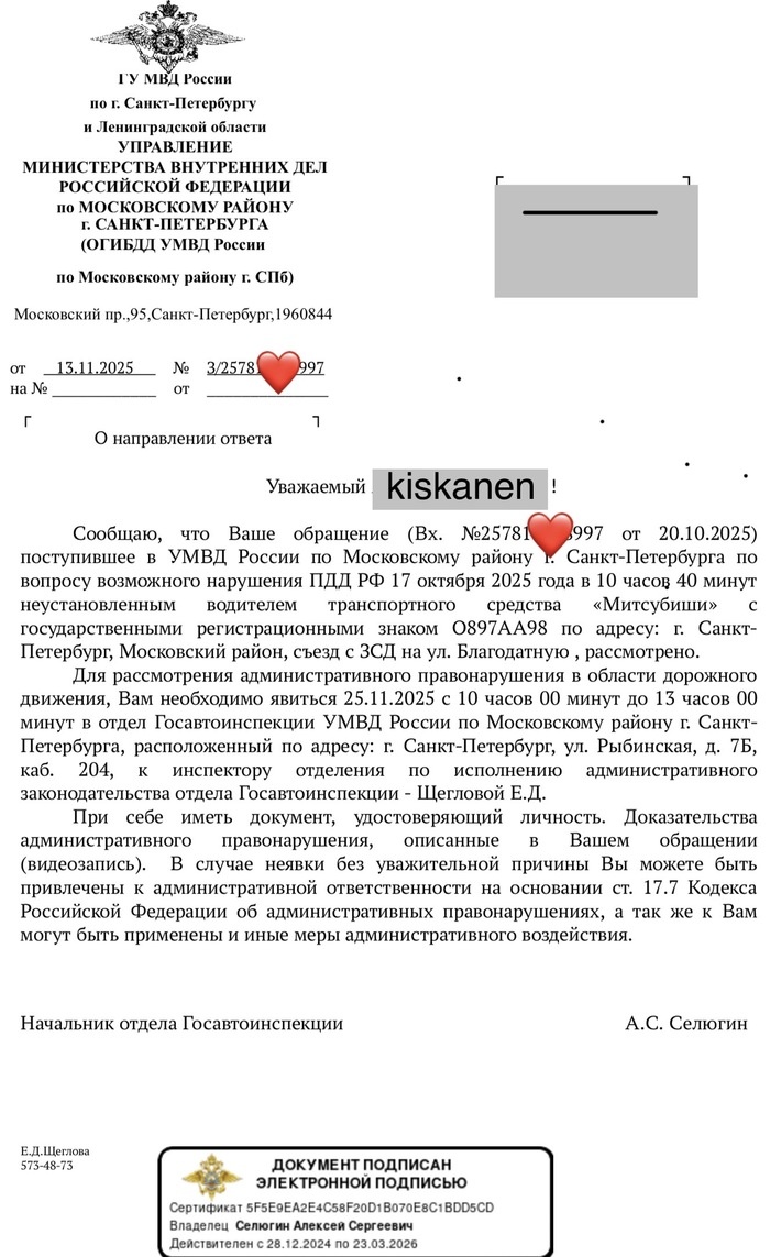 Зафиксировал на видеорегистратор грубое нарушение ПДД. Проезд на красный свет. (Таксист, белая машина справа на видео, тоже потом на красный проехал. 2 заявления написал) Добросовестно отправил сообщение в ГАИ. Получил в ответ: Собственно, само нарушение: В указанные даты не могу прибыть к инспектору. Планирую быть в отпуске. По указанному в письме номеру не дозвониться. Участок, где произошло нарушение, как новогодняя елка игрушками, утыкан камерами. Е.Д. Щеглова могла бы посмотрел сама, если бы хотела работать. Уважаемая Госавтоинспектор Е.Д. Щеглова. Прошу просмотреть видео нарушения ПДД на сайте Пикабу и не применять ко мне административные санкции в соответствие со ст. 17.7 кодекса РФ об административных правонарушениях. Пост автора Kiskanen. Читать комментарии на Пикабу.