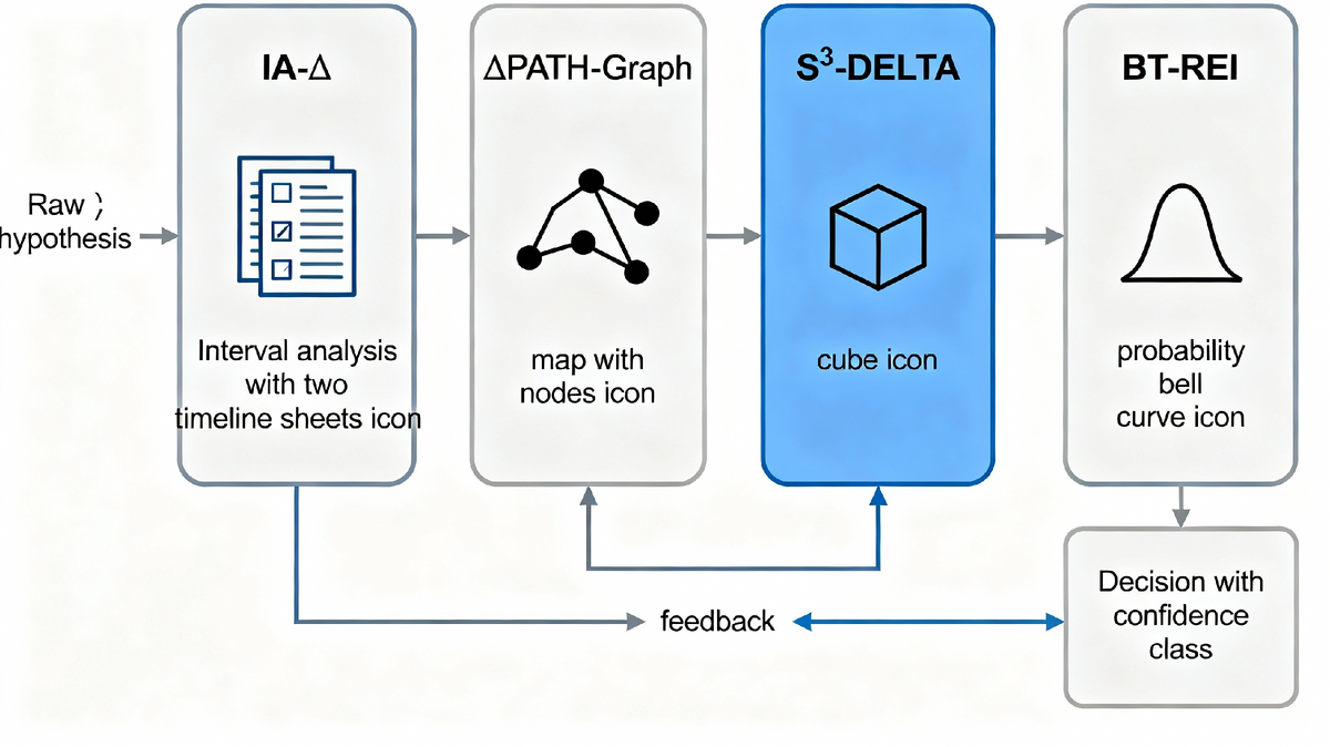 S³-DELTA находится в центре этой цепи. Она не первая (IA-Δ готовит интервальные кандидаты, ΔPATH-Graph фильтрует невозможное), и не последняя (BT-REI уточняет вероятности). Но S³-DELTA — это судья, которая выносит окончательный вердикт.