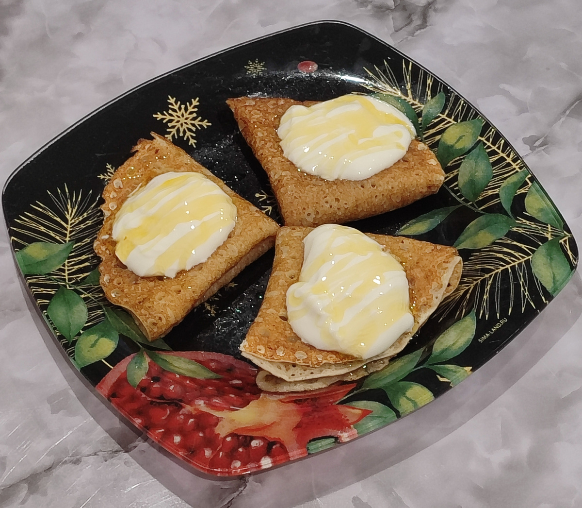 Три покупных блинчика "искупала" в разогретой сковороде в трёх граммах сливочного масла, сложила каждый блинчик вчетверо, полила их сметаной и мёдом. И мне было умопомрачительно вкусно 😋