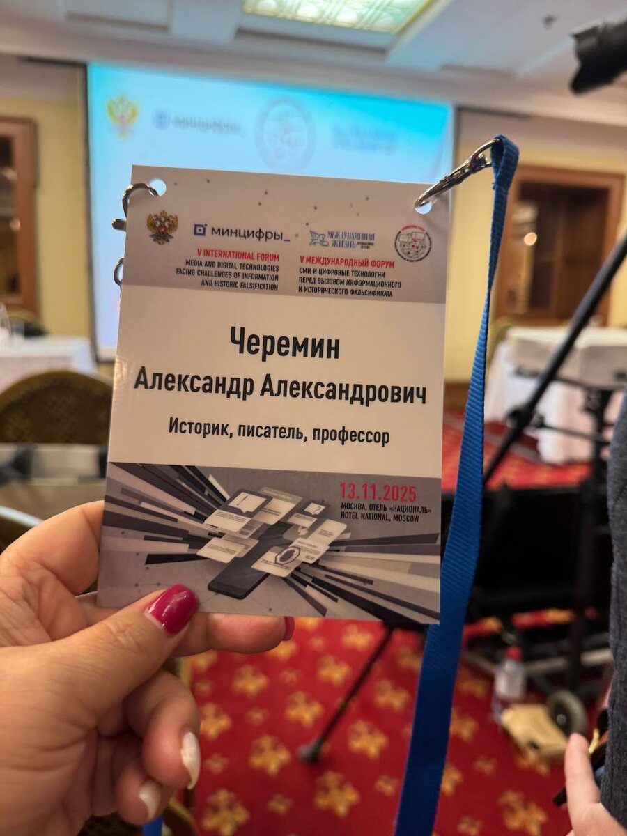 Отель «Националь», 13 ноября 2025 года принял участие в V Международном форуме «СМИ и цифровые технологии перед вызовом информационного и исторического фальсификата». Тема моего доклада, в заключении форума, «Архив академика Б.А. Рыбакова - как исторический источник».