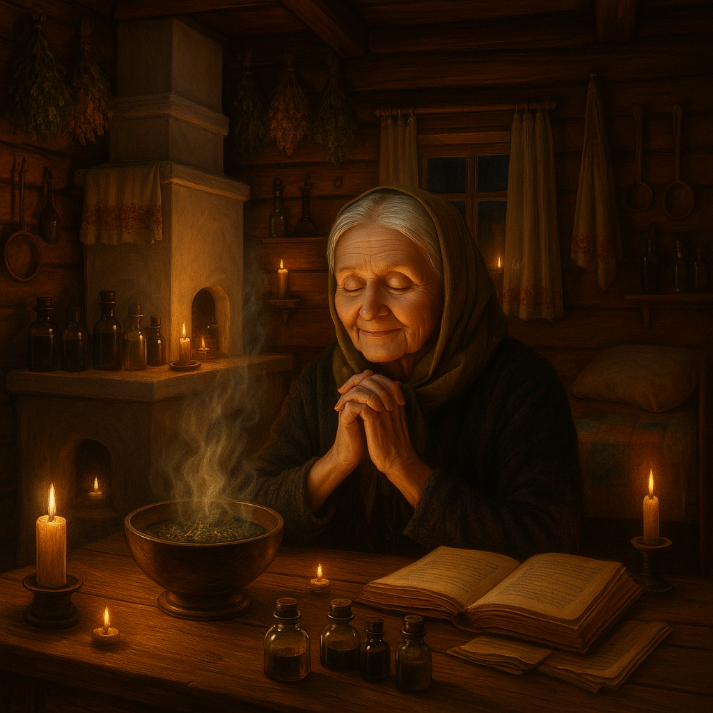Иван открыл двери и, пригнувшись, вошёл в избушку. Несмотря на небольшие размеры комнаты и низкий потолок, было здесь светло и чисто. Светлая русская печь слева от дверей и напротив неё застеленная лоскутным покрывалом кровать с льняным пологом делали жилище уютным. По стенам висели пучки сушёных трав и деревянная утварь, стояли пузырьки с зельями, и снадобьями, кое-где были разложены раскрытые книги в переплётах из потёртой кожи. Сама хозяйка сидела за столом, на котором дымились какие-то травы в чаше, и молитвенно сложив руки перед собой и закрыв глаза, шептала что-то с блаженной улыбкой. Повсюду горели свечи, наполняя комнату таинственным светом.