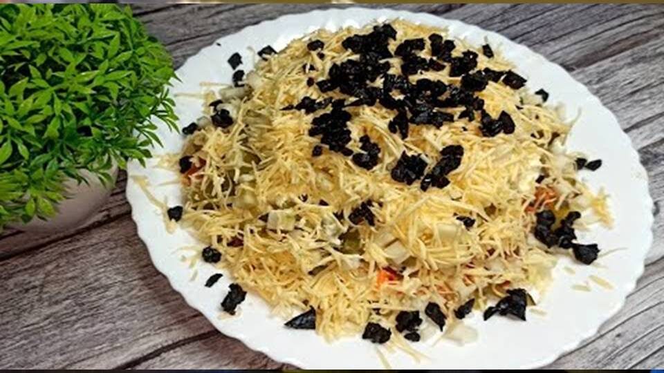 (≈500 г сырого мяса до варки) · Морковь — 120 г · Маринованные огурцы — 2 небольшие · Чеснок — 1 зубчик · Сыр — 100 г · Чернослив — 30 г · Майонез — для смазывания слоёв (по вкусу) 1. Отвари говядину до мягкости, остуди и нарежь мелкими кубиками или разомни волокнами. 2. Морковь отвари или натри сырой (по желанию), затем натри на тёрке. 3. Огурцы нарежь мелкими кубиками, слегка отожми лишний рассол. 4. Сыр натри на мелкой тёрке. 5. Чернослив промой, обсуши и нарежь мелко. 6. Чеснок пропусти через пресс и смешай с небольшим количеством майонеза для аромата. 1. говядина + немного майонеза 2. огурцы 3. морковь + майонез с чесноком 4. чернослив 5. сыр + лёгкая сеточка майонеза Дай салату настояться в холодильнике 1–2 часа — вкус станет ярче и гармоничнее. 💛 Салат получается сытным, но без картофеля — вкус яркий, нежный и немного пикантный благодаря черносливу. Отлично