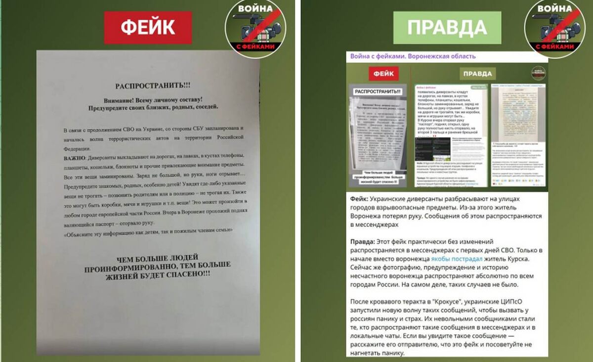 Распространяются ложные утверждения о том, что украинские спецслужбы планируют серию масштабных террористических актов на территории российских городов. Подтверждением этому якобы служит фотография объявления, активно пересылаемая воронежским СМИ. На самом деле угроза совершения массовых терактов в Воронеже и других населённых пунктах России отсутствует. Власти Воронежской области официально опровергли данную дезинформацию. Это сфабрикованное объявление циркулирует в различных мессенджерах практически с начала проведения специальной военной операции. Содержание текста остаётся неизменным. Аналогичный фейк уже был опровергнут, например, в марте 2024 года. Анализ текста и оформления объявления позволяет сделать вывод о его очевидной недостоверности. Авторы обращаются к некому неопределённому «личному составу», не указывая, какую именно организацию они представляют. Стиль изложения разговорный, встречаются пунктуационные неточности. Информация о пострадавшем в результате теракта жителе Во