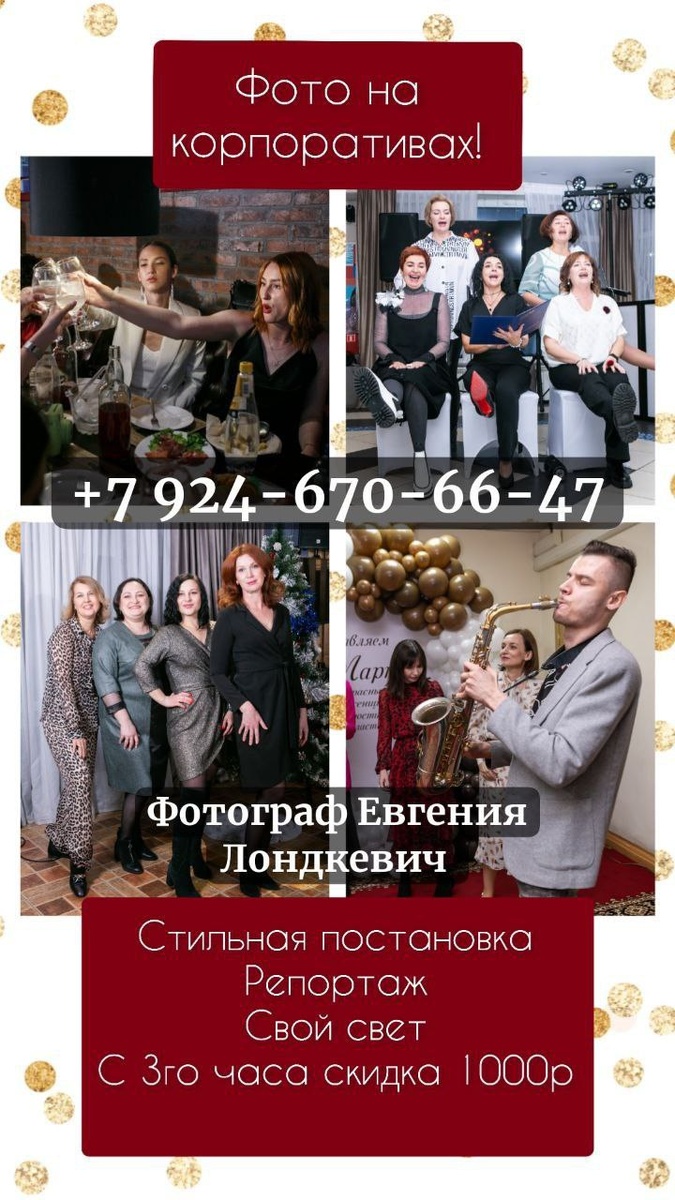 ⛔️ Корпоративы Это когда люди собираются своим трудовым коллективом в красивых нарядах и вспоминают: как это - не работать вместе, а отдыхать)) Если честно, я уже и не помню: как это - корпоративить. Зато прекрасно знаю, как это - снимать интересный репортаж и классную постановку студийного качества в любой кафешечке города. 4 года я снимала свадьбы. И этой школы мне хватило, чтоб наработать автопилот и скорость. Съёмки в ресторанах были до ночи))) Сейчас я уже не готова снимать для вас до ночи, однако несколько часов, чтоб запечатлеть вас красивых и счастливых - легко!!! Стоимость часа = 6000₽ Если заказываете от 3х и более часов, то 5000₽ А если от 2х и более часов, то уже и видео ролик успею снять. Уже начала принимать заявки. Работает правило первого клиента. Бронью даты считается внесение задатка 50% . Остаток вносится в день съемки. Готовность фото - до 7ми дней, смотря какая будет занятость.