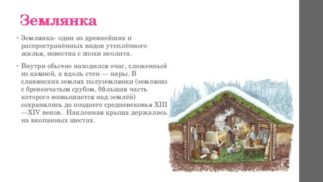 круглую или овальную яму глубиной до метра. По ее краям устанавливали каркас из мощных жердей, который сверху покрывали шкурами животных. Часто этот каркас дополнительно укрепляли костями мамонта — ребрами, черепами, бивнями. Сверху вся конструкция засыпалась землей и дерном, с