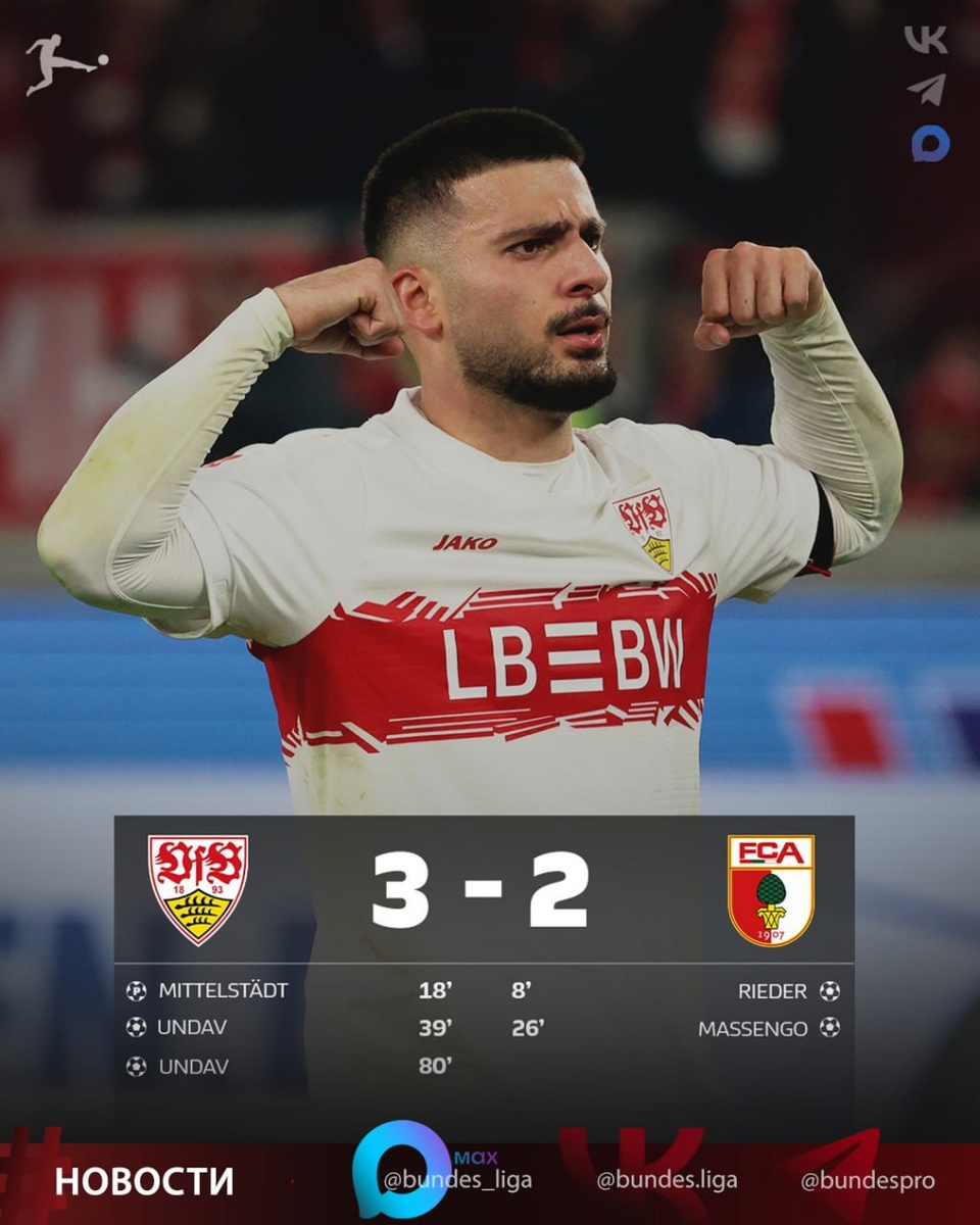 #Бундеслига ⚽️ 10 тур. «Штутгарт» - «Аугсбург» 3:2 На восьмой минуте просто штурм ворот хозяев - голкипер справился с ударами Антона Каде и Алексиса Клода-Мориса, но Фабиан Ридер добавил мяч в сетку (0:1). Соперник отыгрался с пенальти в исполнении Максимилиана Миттельштедта, который перехитрил вратаря (1:1). На 26-й минуте Хан-Ноа Массенго отобрал мяч у защитника и забил второй мяч гостей - 1:2. В конце тайма с подачи Билала эль-Ханнуса метко головой стрельнул Дениз Ундав и сравнял счет. Во втором тайме Ундав оформил дубль с паса Ангело Штиллера - 3:2. «Штутгарт» догнал дортмундскую «Боруссию», «Аугсбург» делит третью строчку, но с конца. ⭐️ MAX /// Видео+ ❤ Телеграм /// Аналитика+ ✅️ Флагманская /// Новости+
