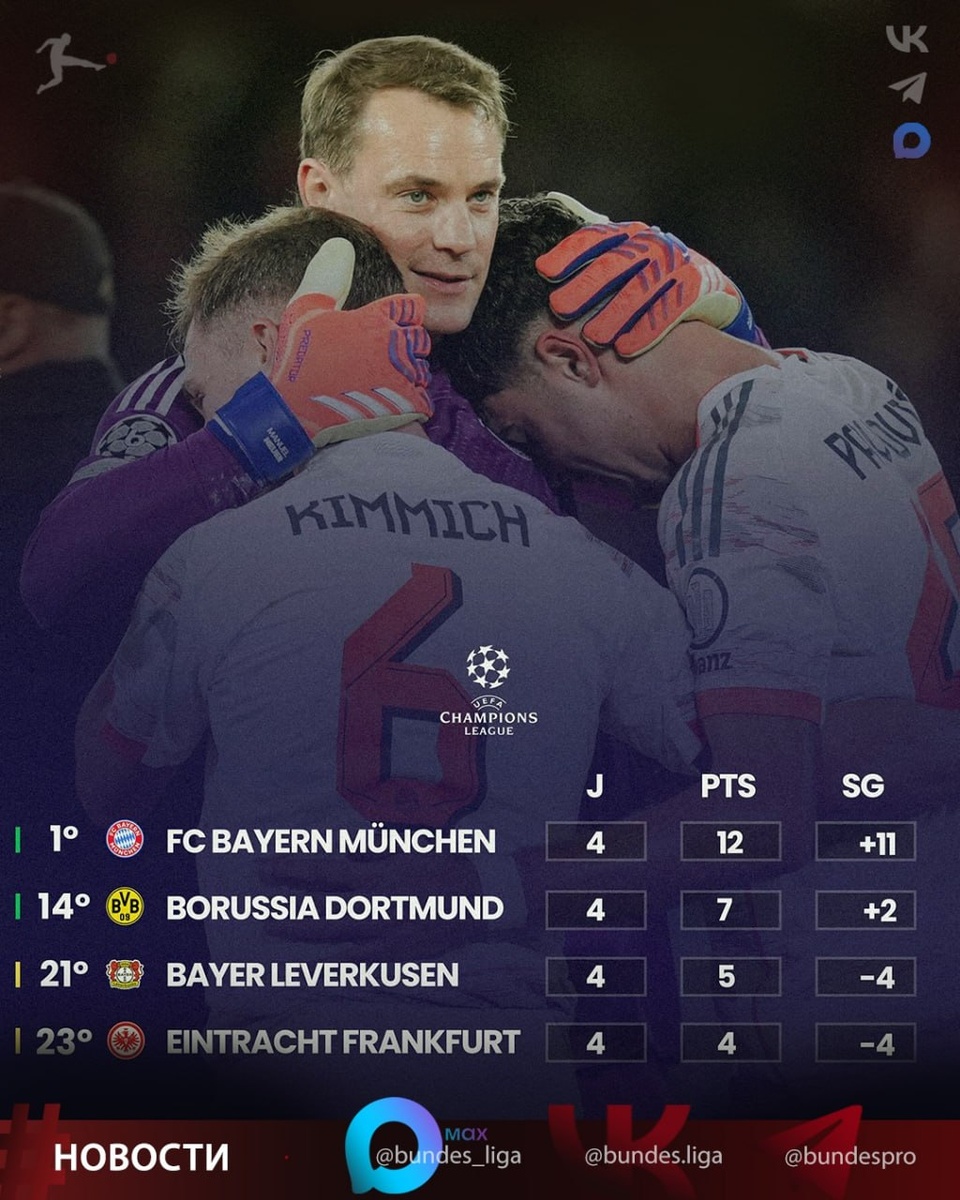 Места немецких клубов в Таблице общего этапа Лиги чемпионов после 4 туров ⚡️ - Максимально возможные 12 очков набрала «Бавария». - В зоне плей-офф находится «Боруссия» Дортмунд. - «Байер 04» и «Айнтрахт Ф» в зоне стыков. 👉 В плей-офф попадают 24 клуба. Первые восемь получают место в 1/8 финала, оставшиеся — отправляются в стыковые матчи. 📝 Команды, занявшие места с 9-го по 16-е, будут сеяными и проведут ответные встречи на своём поле. Соответственно, команды с 17-го по 24-е место первый стыковой матч проведут дома. ⭐️ MAX -❤ Телеграм - ✅️Вконтакте