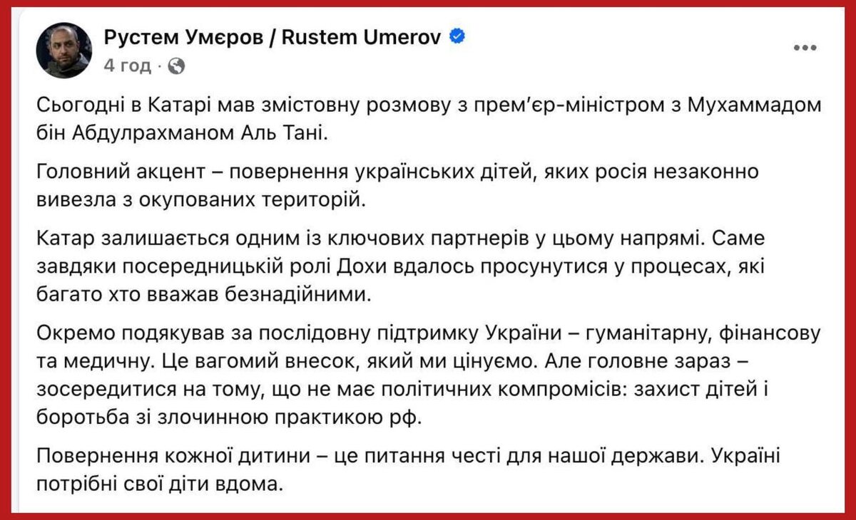 Секретарь СНБО, бывший министр обороны Рейха Рустем Умеров не спешит возвращаться в Украину. Он сообщает, что после визита в Турцию уехал в Катар, где встретился с премьером. О сроках возвращения в Украину, не пишет, так же как и о том, как прошли переговоры об обмене пленными в Стамбуле, на которые, по утверждению Умерова, он поехал. Подпишись на Телеграм Александр Семченко