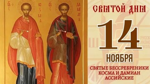 14 ноября 2025 года - пятница, седмица 23-я Православная Церковь чтит память: — Бессребреников и чудотворцев Космы и Дамиана Асийских и матери их преподобной Феодотии (III) — Священномучеников Иоанна, епископа и Иакова Ревнителя, пресвитера, в Персии пострадавших (ок. 345) — Мученика Петра Игнатова (1941) -------------------------------------------- Поздравляем всех именинников с днем Ангела! Косма, Дамиан, Иоанн, Иаков, Александр, Феодор, Димитрий, Петр, Елисавета ---------------------------------------- 🍵 ПОСТ И ТРАПЕЗА 14 ноября 2025 г., пятница, день постный ---------------------------------------- ИСТОРИЧЕСКИЕ СОБЫТИЯ — 14 ноября 1969 г. родился митрополит Красноярский и Ачинский Никита (Ананьев) --------------------------------------------- 👀 ИНТЕРЕСНЫЕ ФАКТЫ ИЗ ЖИТИЯ СВЯТЫХ И ИСТОРИИ ПРАЗДНИКА — Святые бессребреники Косма и Дамиан Асийские были прославлены Церковью не только за бескорыстное служение ближним, но и за верность друг другу. Братьев объединяли общее де