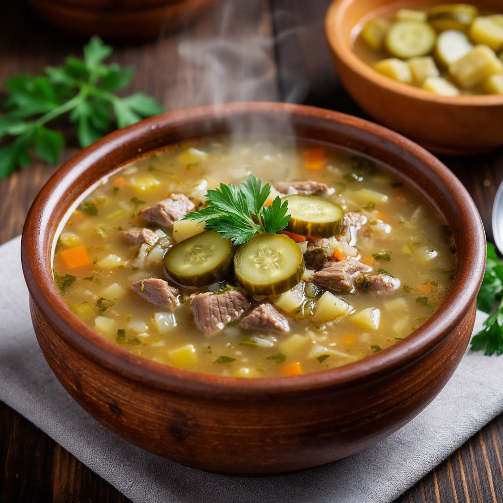 Рассольник — это традиционный русский суп с острым кисловатым вкусом, который готовится на основе солёных огурцов, огуречного рассола и крупы (чаще перловки или риса). Его история уходит корнями в глубокую древность, а рецепт формировался веками. Предком современного рассольника считается калья — кислый суп, который готовили на Руси ещё в XV веке. Калья готовилась на основе огуречного рассола, солёных огурцов, иногда солёных лимонов и подавалась с мясом, рыбой или икрой. В старину рассолы были популярны в русской кухне, особенно зимой, когда свежие овощи были недоступны. Само слово «рассольник» происходит от слова «рассол» — жидкости, получаемой при засолке овощей. Впервые термин «рассольник» в значении супа зафиксирован в XV веке, когда калья начала трансформироваться в более современный вариант с добавлением круп, таких как перловка или рис. Интересно, что в записках Николая Гоголя XIX века упоминается рассольник как пирог с курицей, гречневой кашей, яйцами и рассолом. Также в ст